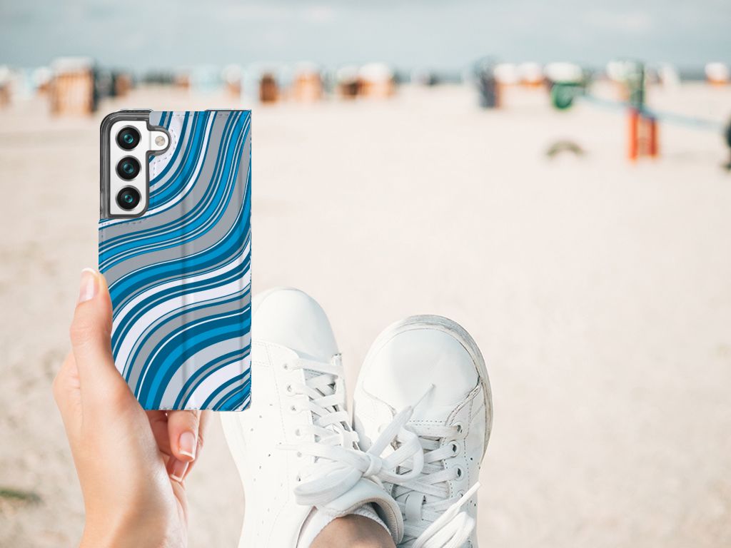 Zeer cool, dit hoesje met vooral blauwe kleuren, die in een golvende beweging jouw telefoon van een mooie uitstraling voorzien. Tijdens een zonnige vakantie aan zee is jouw smartphone perfect beschermd met dit telefoonhoesje. Het design Waves Blue van dit smartphone hoesje doet lichtjes denken aan een lolly, waarmee je een klein kind zeer blij maakt. Jouw Samsung Galaxy S22 zal er ook zeer vrolijk uitzien samen met dit design hoesje. De witte en grijze kleuren staan in mooi contrast met het blauw, waardoor de uitstraling van deze accessoire zeer mooi is. Ook voor andere kleuren kun je natuurlijk uitstekend terecht in ons assortiment. Het design staat op een Hoesje met Magneet. Deze case beschermt jouw telefoon aan alle kanten en beschikt over een 1 opbergvakje en een speciale standaard. Het hoesje wordt afgesloten met een magneet aan de binnenzijde. De houder aan de binnenzijde is van TPU.