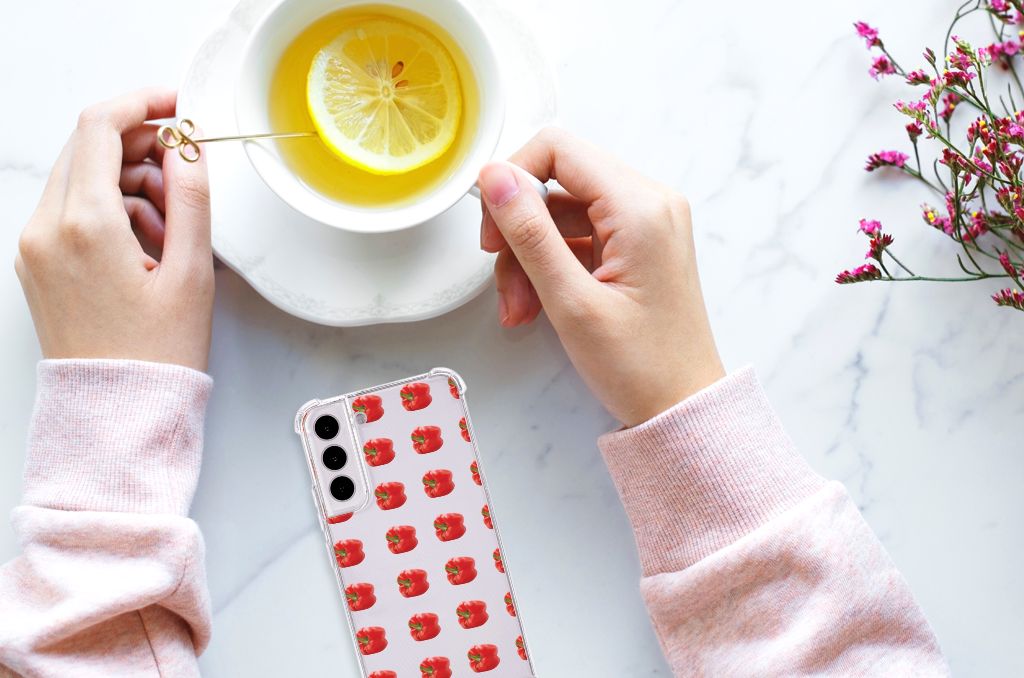 Ben je op zoek naar een uniek telefoonhoesje voor je Samsung Galaxy S22 Plus? Dan ben je bij B2C Telecom aan het juiste adres! Speciaal voor jou hebben we dit prachtige Paprika Red design in onze collectie hoesjes opgenomen. Het design wordt bedrukt op een Beschermhoes en is gemaakt van flexibel rubber. Het hoesje is perfect voor de actieve smartphonegebruiker door de opstaande randen/hoeken. Denk aan mensen die veel sporten, reizen of wandelen en net iets meer zekerheid willen als het op hun geliefde telefoon aankomt. Het design wordt alleen aan de bovenkant van het hoesje bedrukt en de randen blijven transparant. Aan de zijkanten zijn uitsparingen gemaakt waardoor je met gemak alle knoppen en poorten kunt bedienen. Wij adviseren om dit hoesje in combinatie met een screenprotector te gebruiken voor een langere levensduur van je telefoon. Wil je dit hoesje nog iets extra's geven? Voeg dan gratis je naam of een quote toe! Is dit design hoesje toch niet helemaal wat je zocht? Ontwerp dan zelf een hoesje in ons ontwerpprogramma.