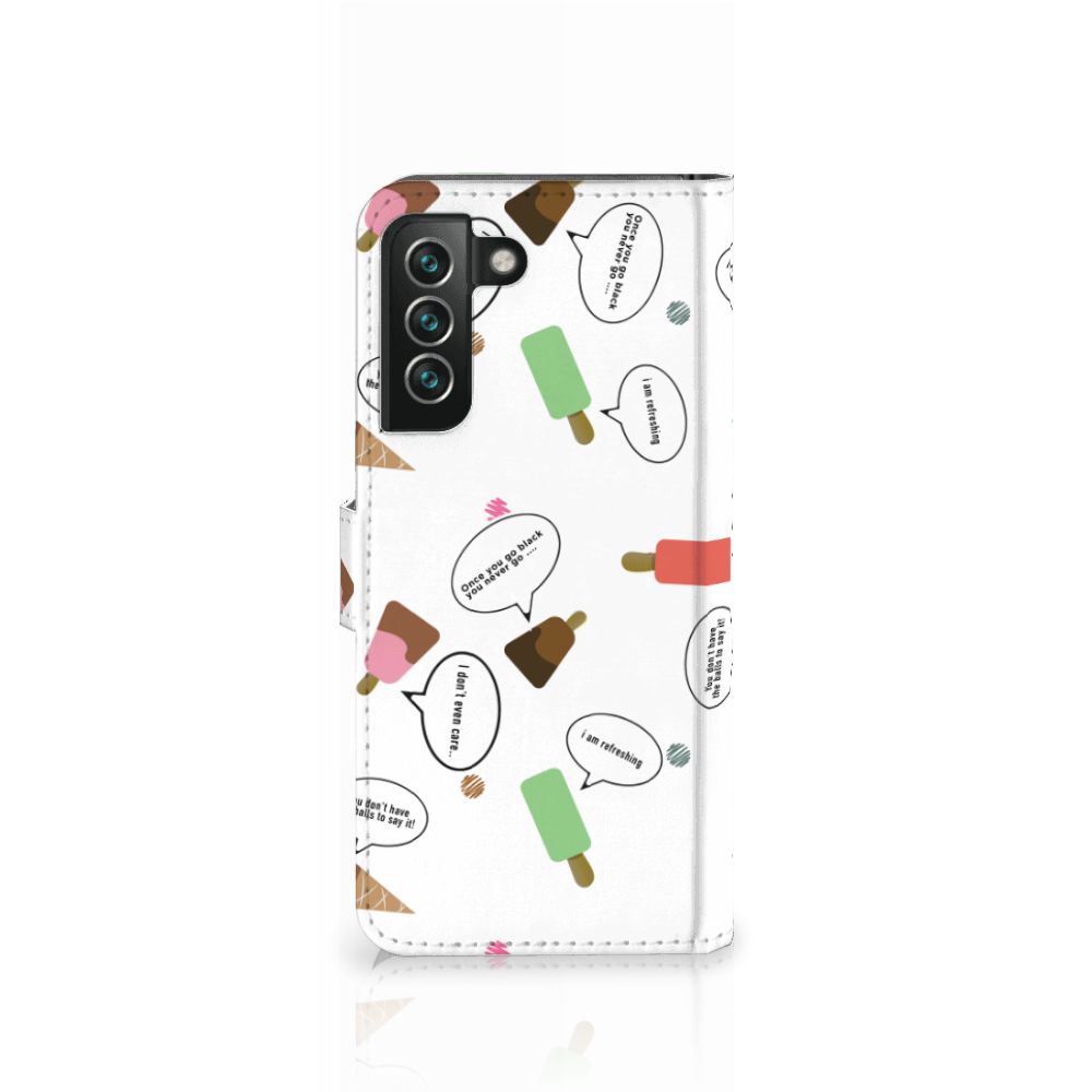 Van dit vrolijke Samsung Galaxy S22 Plus Book Cover met daarop verschillende soorten ijsjes met tekstwolkjes krijg je sowieso een vrij en zomers gevoel. De zomer komt naar je toe met deze print van ijsjes met tekstwolkjes. Ben je op het strand, dan ontbreekt een lekker ijsje natuurlijk niet. Net zoals je je smartphone bij de hand hebt, met daaromheen een design hoesje met bijzondere ijsjes en tekstwolkjes. Jouw telefoon kan dan de bescherming in de vorm van een boekhoesje met ijsjes zeer goed gebruiken. Alle zijden van dit hoesje worden bedrukt met ijsjes en tekstwolkjes. De case heeft een lipje aan de buitenzijde voor het afsluiten van de telefoon en de houder aan de binnenzijde is van TPU. Onder alle weersomstandigheden zal deze case met verschillende opbergvakjes perfect functioneren, ook op het strand met een ijsje in je hand.