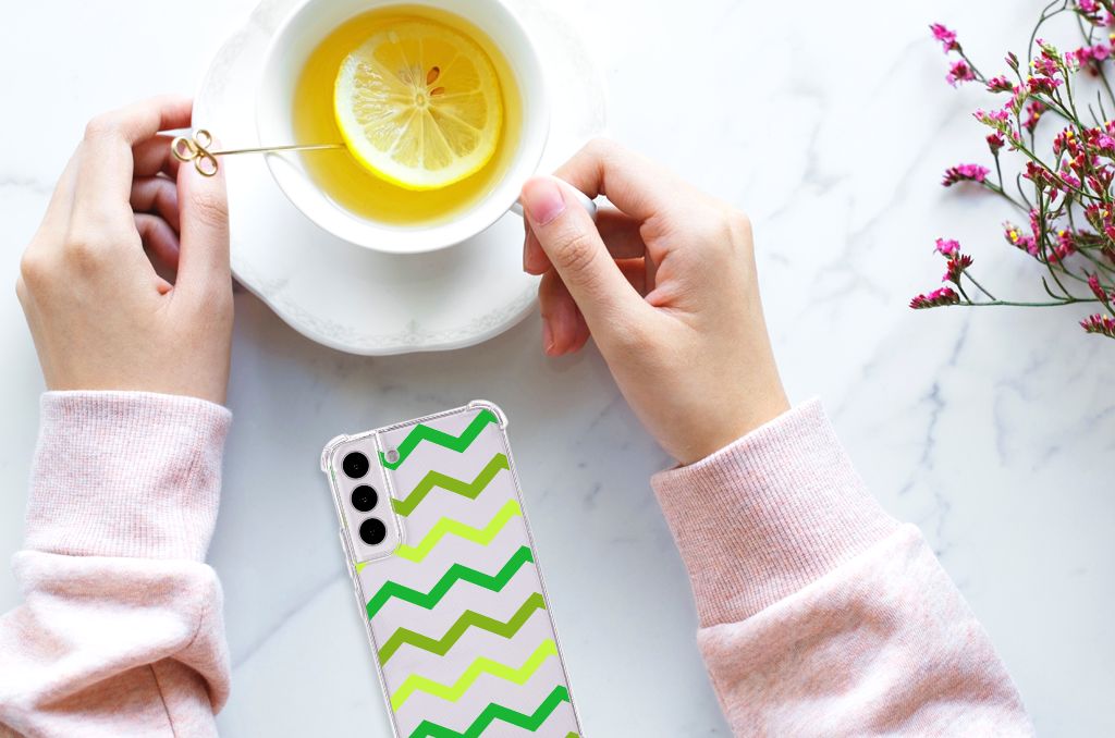 Ben je op zoek naar een uniek telefoonhoesje voor je Samsung Galaxy S22 Plus? Dan ben je bij B2C Telecom aan het juiste adres! Speciaal voor jou hebben we dit prachtige Zigzag Groen design in onze collectie hoesjes opgenomen. Het design wordt bedrukt op een Doorzichtige Silicone Hoesje en is gemaakt van flexibel rubber. Het hoesje is perfect voor de actieve smartphonegebruiker door de opstaande randen/hoeken. Denk aan mensen die veel sporten, reizen of wandelen en net iets meer zekerheid willen als het op hun geliefde telefoon aankomt. Het design wordt alleen aan de bovenkant van het hoesje bedrukt en de randen blijven transparant. Aan de zijkanten zijn uitsparingen gemaakt waardoor je met gemak alle knoppen en poorten kunt bedienen. Wij adviseren om dit hoesje in combinatie met een screenprotector te gebruiken voor een langere levensduur van je telefoon. Wil je dit hoesje nog iets extra's geven? Voeg dan gratis je naam of een quote toe! Is dit design hoesje toch niet helemaal wat je zocht? Ontwerp dan zelf een hoesje in ons ontwerpprogramma.