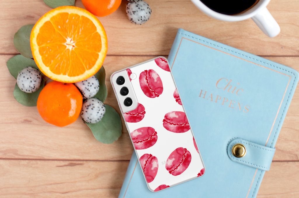 Dit tpu hoesje met Pink Macarons is een zeer opvallende bescherming voor jouw smartphone. Macarons zijn Franse koekjes: kleine, rond en luchtig. Ze worden in veel verschillende smaken gemaakt, herkenbaar aan de verschillende kleuren zoals chocolade (donkerbruin), mokka (middenbruin), kersen (rood), pistache (groen), aardbei (roze), framboos (karmijn). Deze kleuren kun je niet allemaal zien op dit fraaie design hoesje met roze macarons. Heb je altijd al een Samsung Galaxy S22 Plus Siliconen Case willen hebben met roze macarons? Grijp dan nu je kans. Deze case heeft zeer veel goede eigenschappen, zoals elastisch vermogen, flexibiliteit en schokbestendigheid. Dit design hoesje met roze macarons wordt aan de bovenkant bedrukt, de zijkanten blijven doorzichtig. De case heeft opstaande randen aan de voorzijde en beschermt samen met een screenprotector jouw telefoon perfect. De case heeft ook een handige standaard.