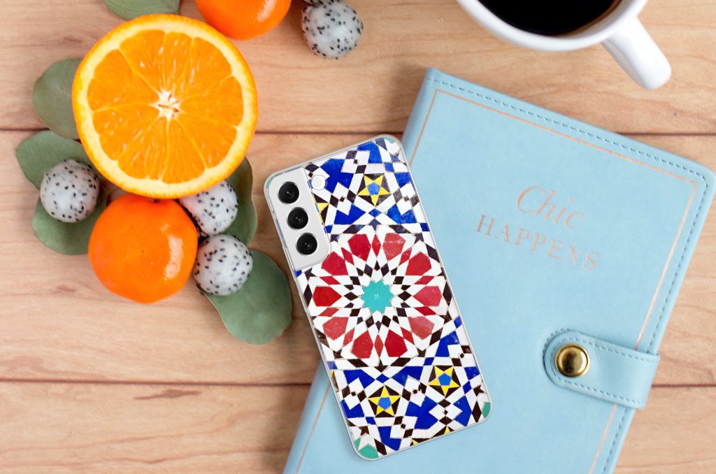 Aan design hoesjes met kunstvormen geen gebrek in onze uitgebreide collectie. Wat dacht je van dit design hoesje met Mozaïek . Dit is een kunstvorm waarbij een grote afbeelding wordt gemaakt uit een groot aantal kleine gekleurde steentjes (tesserae), die in een vloer of wand worden gemetseld. Deze gekleurde steentjes zie je terug op deze tpu case met design van mozaïek. Een tpu case is zeer flexibel. Een Samsung Galaxy S22 Plus TPU Siliconen Hoesje met print zorgt voor een bescherming van de achterzijde en zijkanten van je smartphone. Deze zijkanten worden niet bedrukt. De Grieken en Romeinen beheersten de kunst al. Op diverse plaatsen in Europa zijn mozaïeken teruggevonden die tot op de dag van vandaag goed bewaard zijn gebleven. Met een tpu hoesje met mozaïek blijft jouw telefoon in tact.