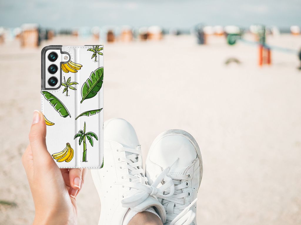 Heb jij al zin om op vakantie te gaan? Dat krijg je hoe dan ook als je één blik werpt op dit vrolijke hoesje voor je Samsung Galaxy S22 met Banana Tree design. Het fleurige tafereel van bananenbomen, bananenbladeren en bananen doet je gedachten afdwalen naar paradijselijke bountystranden met azuurblauwe zee en helderwitte zandpartijen. Kortom: dit hoesje is goed voor je humeur. Naast het luchtige design zijn daar nog meer redenen voor, want dankzij de stevige materialen weet je zeker dat dit Smart Cover je telefoon altijd optimaal beschermt. De solide hoes van PU-leer beschikt ook over een 1 pashouder en een speciale standaard. Het hoesje wordt afgesloten met een magneet aan de binnenzijde. De houder aan de binnenzijde is van TPU. Alle zijden worden bedrukt. Met dit hoesje breng je jezelf in zomerse sferen en gun je jezelf een krasvrije telefoon.