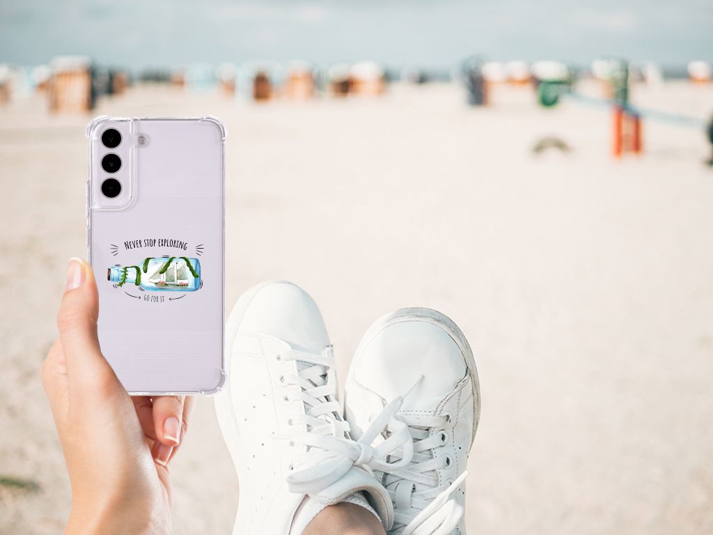 Dit leuke design met een schip in een fles is voor de echte avonturier of reiziger. Dankzij de tekst ‘Never stop exploring: Go for it’ word je altijd herinnerd aan het feit dat het volgende avontuur weer op de loer ligt! Dit design staat op een Stevig Bumper Hoesje voor je Samsung Galaxy S22. Een TPU Case anti-shock is perfect voor de actieve smartphonegebruiker. Denk aan mensen die veel sporten, reizen of wandelen en net iets meer zekerheid willen als het op hun geliefde telefoon aankomt. Het hoesje biedt stevige bescherming dankzij de opstaande randen. Het hoesje is volledig gemaakt van TPU, een supersterk maar ook licht en flexibel materiaal dat jouw telefoon optimaal beschermt.