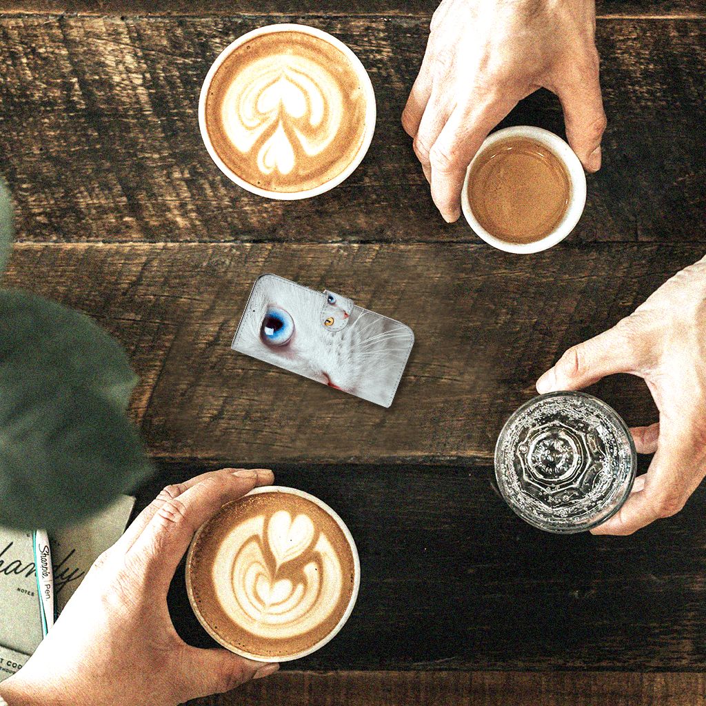Witte katten zijn erg bijzonder en dat is precies de reden dat wij deze op prominente wijze op dit design hoesje hebben geplaatst. Maar deze witte kat is extra speciaal, doordat de ogen twee verschillende kleuren hebben: blauw en vurig rood. Hiermee heb jij als uniek mens ook een unieke bookcase. Ook de manier waarop dit telefoonhoesje voor de Samsung Galaxy S22 is bedrukt, is bijzonder. Je ziet namelijk een kleinere versie van dezelfde kat terug op het lipje. Hierdoor zie je de speciale witte kat twee keer terugkomen op jouw hoesje. Omdat je waarschijnlijk een dierenliefhebber bent als je dit Telefoonhoesje met Pasjes uitkiest, is dit ook een erg duurzaam hoesje. Het hoesje wordt aan alle kanten met duurzame inkt bedrukt.