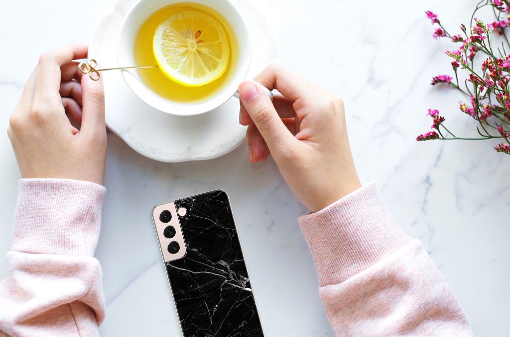 Dit design hoesje met Marmer Zwart is voor de artistieke personen onder ons. De Grieken en Romeinen wisten het materiaal al te waarderen door het in de bouw toe te passen. Naast het witte marmer met haar zacht grijze geaderde belijning zijn de diverse soorten in een gevarieerd kleurenpallet te krijgen. We hebben mooie kleuren op design hoesjes gezet, zoals in dit geval zwart marmer. Dit is een Samsung Galaxy S22 TPU Siliconen Hoesje met marmer in bruine kleur. Het marmer wordt bedrukt op de voorkant van een tpu case, die beschikt over opstaande randen aan de voorkant en heel goed combineert met een screenprotector van glas of van folie. De rijkdom aan kleuren en varianties in afwerking geeft ontwerpers de vrijheid om met marmer hele mooie architectonische projecten te realiseren. Wij hebben onze designer tevens veel vrijheid gegeven. Het resultaat zie je terug in deze tpu case met zwart marmer, die jouw smartphone goed beschermt. De zijkanten van de case worden niet bedrukt met het zwarte marmer.