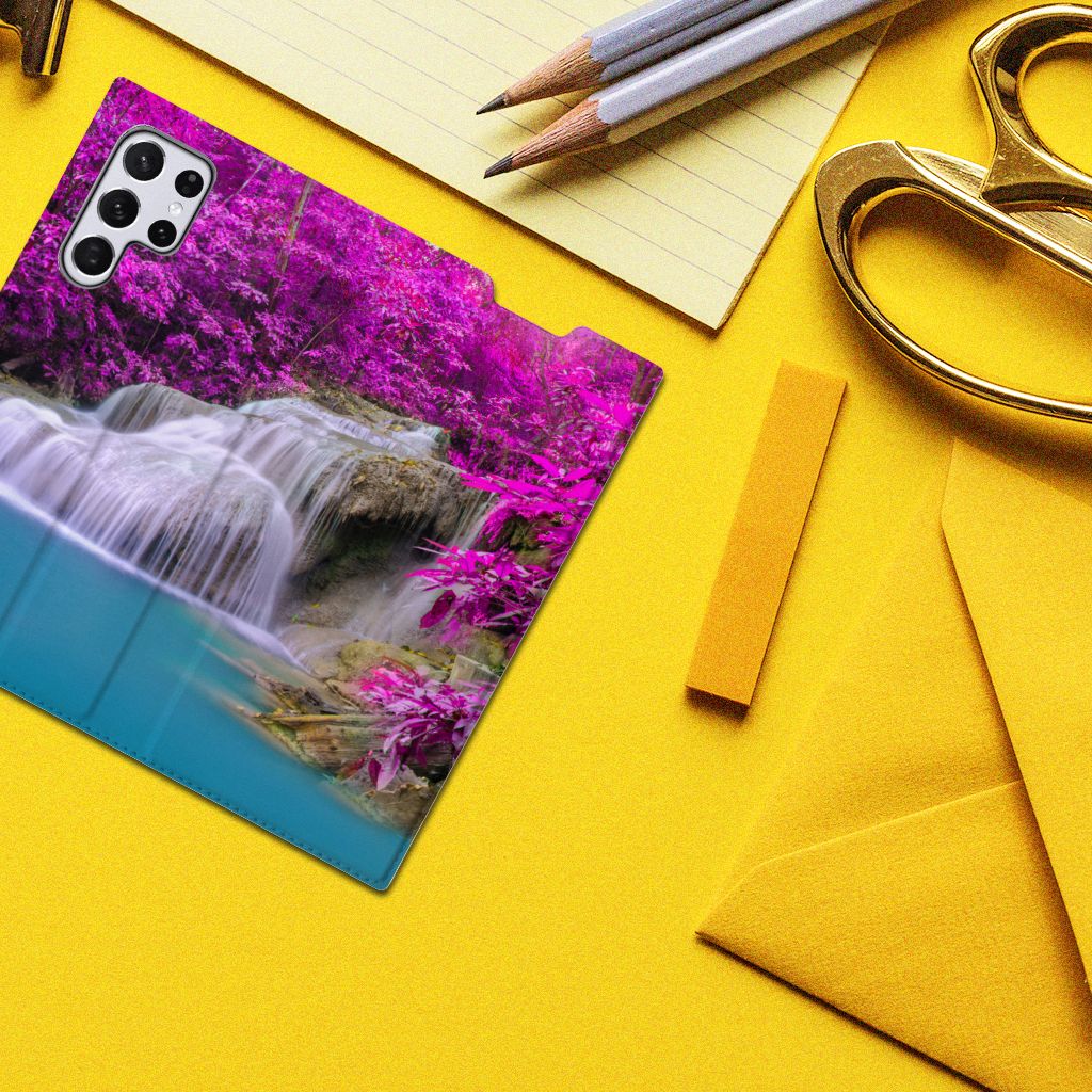 Van een waterval kun je een heel rustig gevoel krijgen, zeker als die op een Samsung Galaxy S22 Ultra Book Cover staat dat jouw smartphone perfect beschermt tegen allerlei vormen van schade zoals krassen, barsten en scheuren. In de buurt van een waterval ben je tijdens warme zomerdagen niet alleen verzekerd van aangename verkoeling, het is ook een bijzonder rustgevende ervaring. Uit onderzoek blijkt zelfs dat watervallen een helend effect hebben op allerlei aandoeningen. Extra bijzonderheid aan de stand case vormen de paarse bossen op de achtergrond. Dit smartphonehoesje beschermt jouw telefoon aan alle zijden en beschikt over een opbergvakje voor pasjes en briefgeld. De case sluit perfect af dankzij de magneten van binnen. De houder aan de binnenzijde is van TPU. Alle zijden van het hoesje worden bedrukt. Een mooiere waterval met paarse achtergrond kom je op geen enkel ander hoesje tegen.