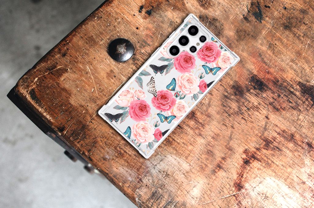 Ben je op zoek naar een uniek telefoonhoesje voor je Samsung Galaxy S22 Ultra? Dan ben je bij B2C Telecom aan het juiste adres! Speciaal voor jou hebben we dit prachtige Butterfly Roses design in onze collectie hoesjes opgenomen. Het design wordt bedrukt op een Case en is gemaakt van flexibel rubber. Het hoesje is perfect voor de actieve smartphonegebruiker door de opstaande randen/hoeken. Denk aan mensen die veel sporten, reizen of wandelen en net iets meer zekerheid willen als het op hun geliefde telefoon aankomt. Het design wordt alleen aan de bovenkant van het hoesje bedrukt en de randen blijven transparant. Aan de zijkanten zijn uitsparingen gemaakt waardoor je met gemak alle knoppen en poorten kunt bedienen. Wij adviseren om dit hoesje in combinatie met een screenprotector te gebruiken voor een langere levensduur van je telefoon. Wil je dit hoesje nog iets extra's geven? Voeg dan gratis je naam of een quote toe! Is dit design hoesje toch niet helemaal wat je zocht? Ontwerp dan zelf een hoesje in ons ontwerpprogramma.