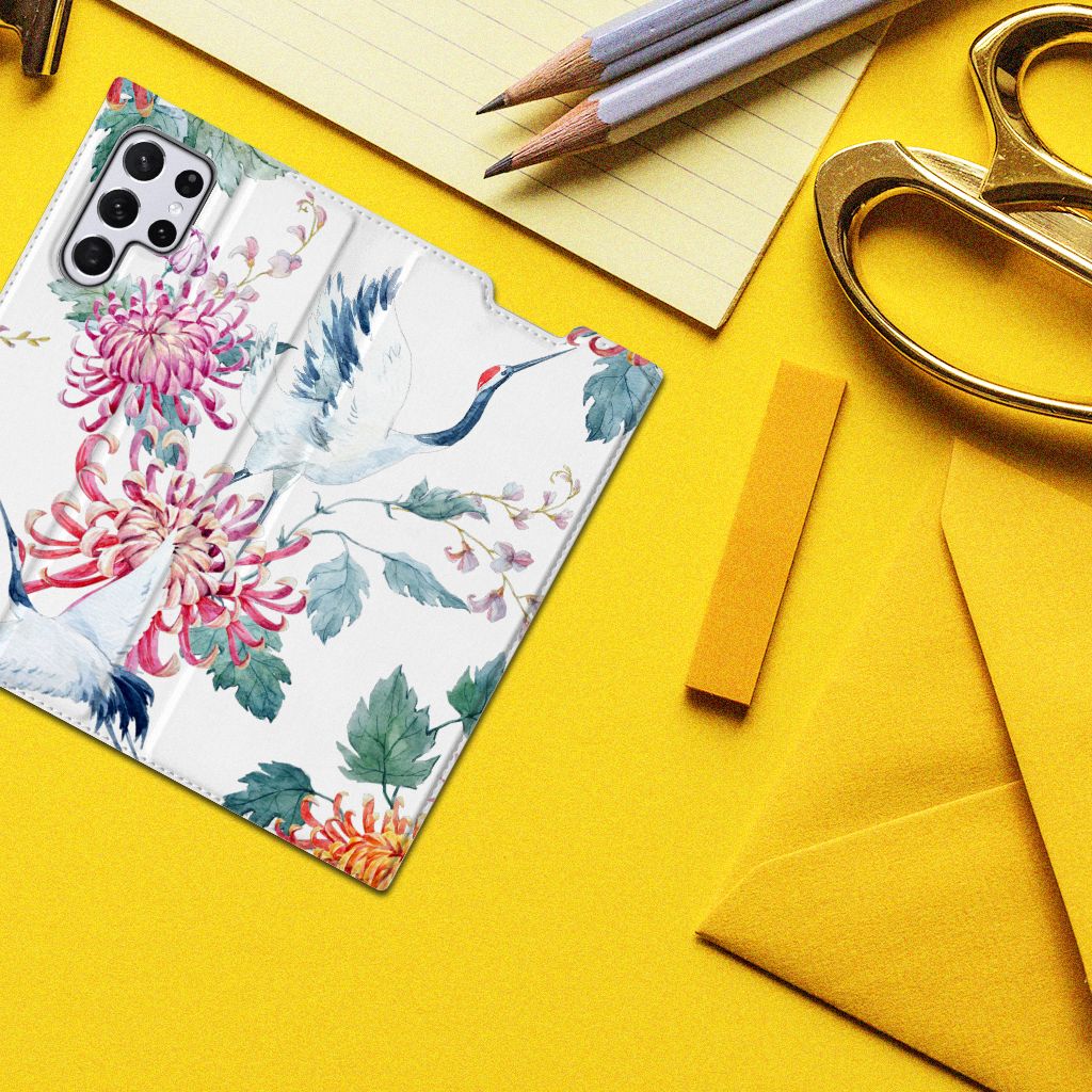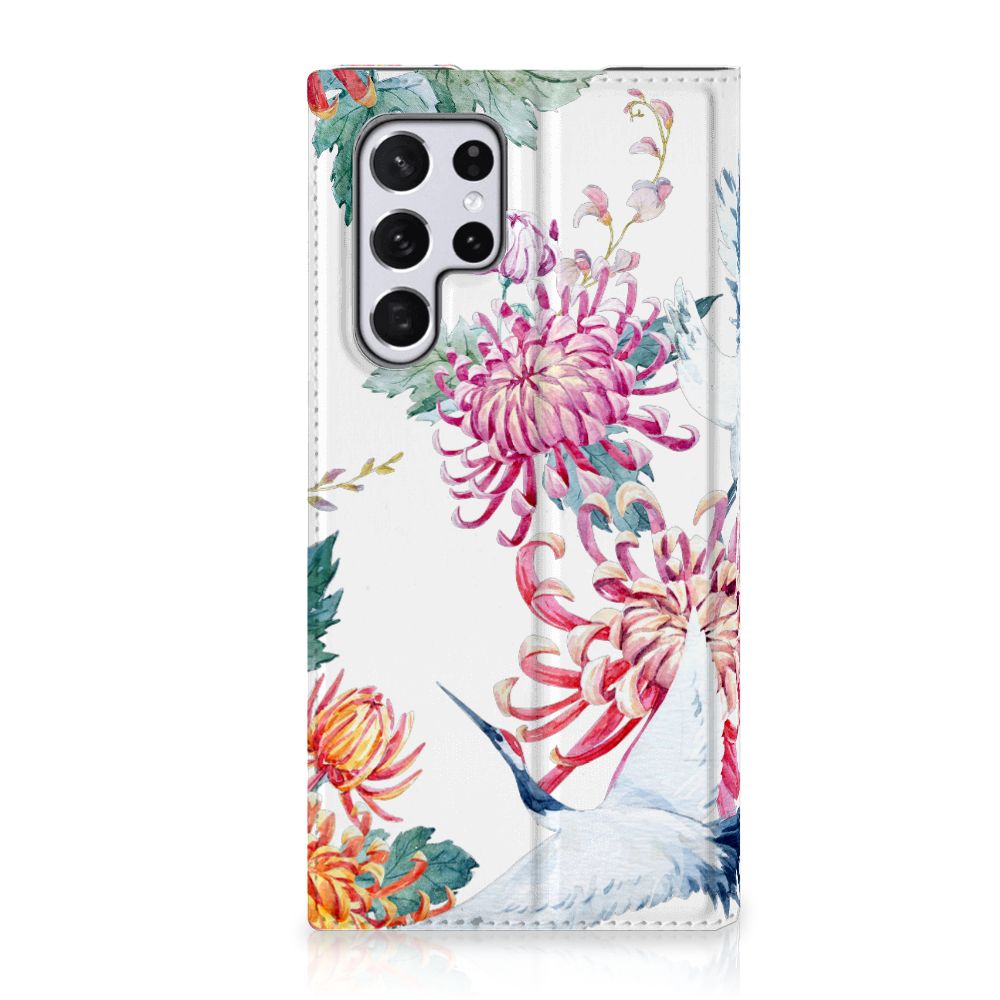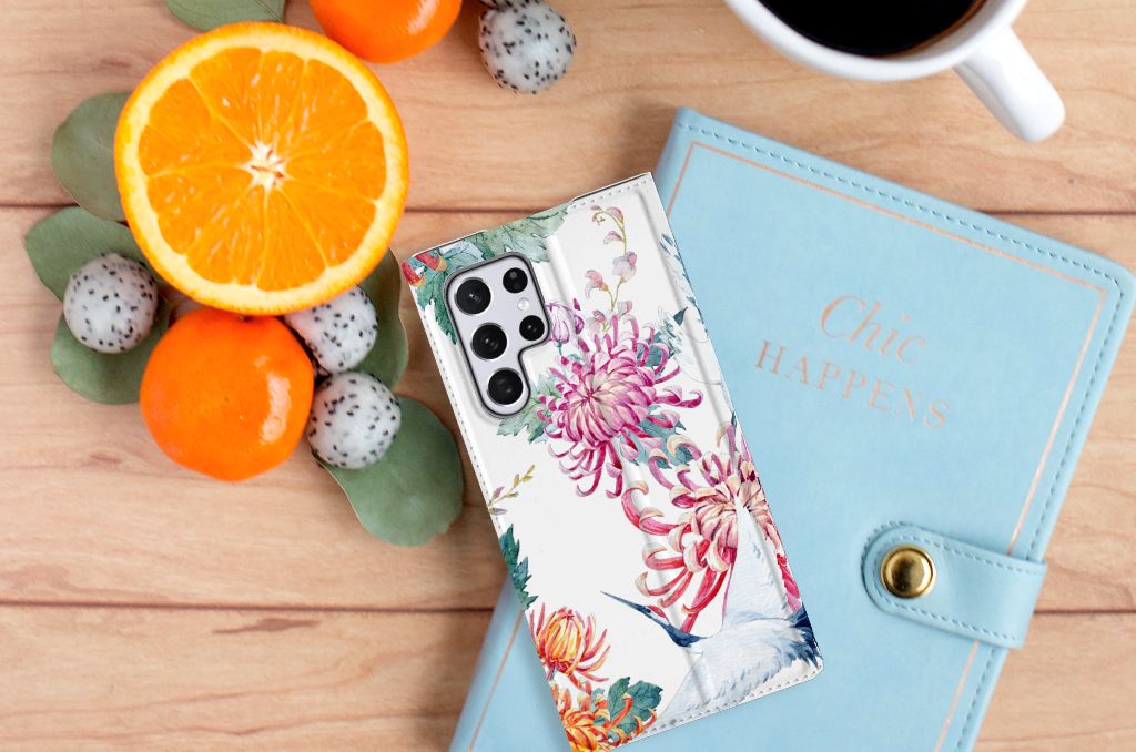 Verspreid over de hele wereld leven 19 soorten ooievaars. De spanwijdte – dat is de afstand van vleugeltip tot vleugeltip – van een volwassen ooievaar kan 2.50 meter bedragen. De gebieden waarin de ooievaar broedt, liggen in heel Europa, het Midden-Oosten, West- en Centraal-Azië en Noordwest-Afrika. Het ideale leefgebied van de ooievaar is een half open tot open landschap met veel afwisseling in grondgebruik en begroeiing. De begroeiing op dit design hoesje, in allerlei verschillende kleuren, zal niet alleen voor de ooievaars fraai zijn. Jij zult er zelf ook heel vrolijk van worden. Het in het oog springende design staat op een Hoesje maken. Deze case beschermt jouw Samsung Galaxy S22 Ultra aan alle kanten en beschikt over een 1 opbergvakje en een speciale standaard. Het hoesje wordt afgesloten met een magneet aan de binnenzijde. De houder aan de binnenzijde is van TPU. Alle zijden van de stand case worden bedrukt.