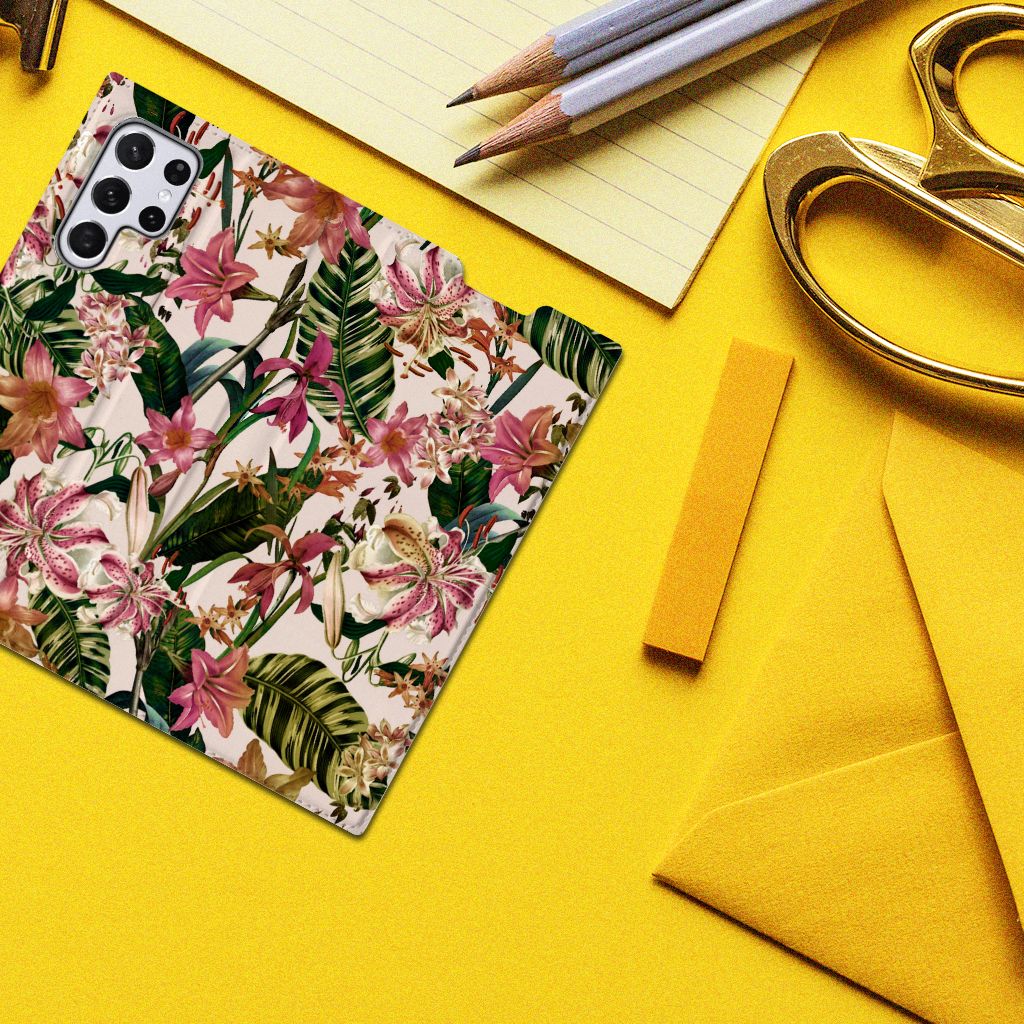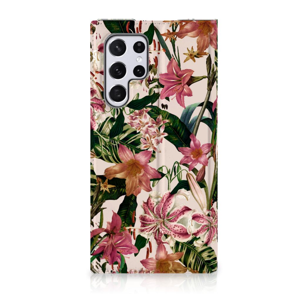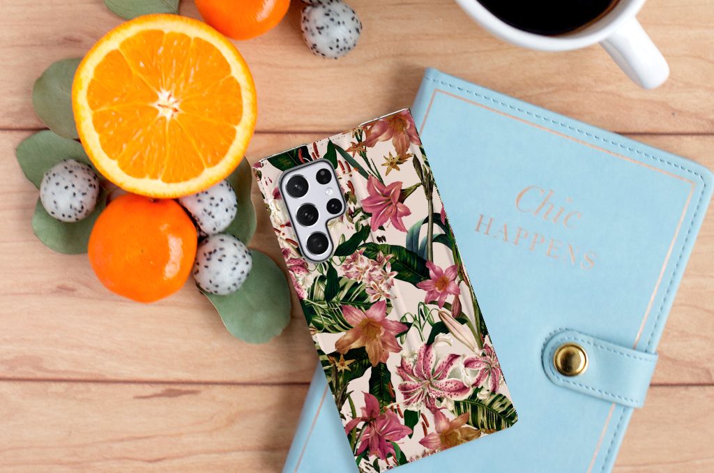 Dit Flowers design is een zegen voor de mens en zijn smartphone. De paarswitte bloemen en groene bladeren op deze Samsung Galaxy S22 Ultra Smart Cover geven jouw smartphone een zeer sierlijke uitstraling. Je krijgt er meteen een goed gevoel bij als je aan het appen, mailen of aan het bellen bent. Valt dan je telefoon op de grond, dan zal er dankzij de stand case met paarswitte bloemen en groene bladeren geen schade ontstaan. Onze stand cases met paarswitte bloemen en groene bladeren bieden de allerbeste bescherming en zijn heel praktisch, wat blijkt uit onder meer het vakje aan de binnenkant en de handige standaard waarmee je de smartphone rechtop op tafel neer kunt zetten. De paarswitte bloemen en groene bladeren komen op alle zijden van de case te staan. Op deze stand case van leer en TPU (houder aan de binnenkant) kun je in no time zelf foto’s van jouw favoriete bloemen zetten.