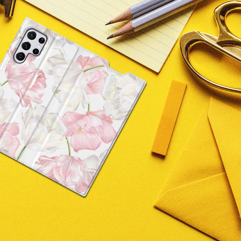 Een bosje bloemen doet een mens (en zijn smartphone) goed. De witte en roze bloemen op dit Samsung Galaxy S22 Ultra Smart Cover geven jouw smartphone een zeer mooie uitstraling. Je wordt er ook meteen een stuk rustiger van als je aan het appen of aan het bellen bent. Valt dan je telefoon op de grond, dan zal er dankzij de stand case met het design Lovely Flowers ontstaan. Onze stand cases met roze en witte bloemen zien er zeer prettig uit en zijn heel praktisch, wat blijkt uit onder meer het vakje aan de binnenkant en de handige standaard waarmee je de smartphone rechtop op tafel neer kunt zetten. De roze en witte bloemen passen goed op alle zijden van de case. Op deze stand case van leer en TPU (houder aan de binnenkant) kun je trouwens ook je eigen bloemige ontwerp zetten. In een paar simpele stappen maak je zelf een stand hoesje met daarop jouw mooiste bloemen.