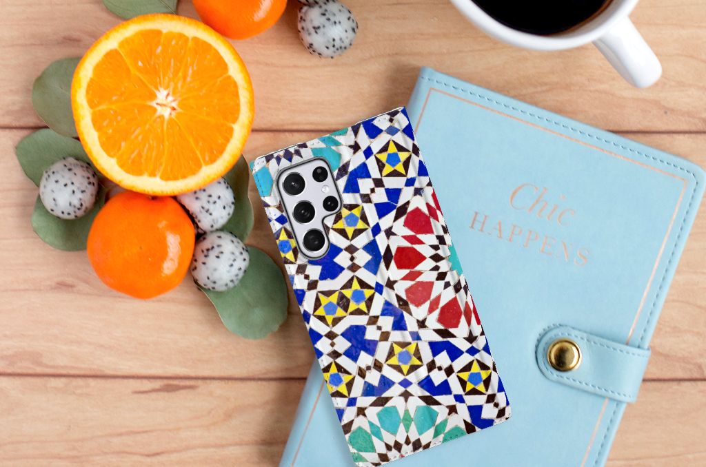 Aan design hoesjes met kunstvormen geen gebrek in onze uitgebreide collectie. Wat dacht je van dit design hoesje met Mozaïek . Dit is een kunstvorm waarbij een grote afbeelding wordt gemaakt uit een groot aantal kleine gekleurde steentjes (tesserae), die in een vloer of wand worden gemetseld. Deze gekleurde steentjes zie je terug op deze stand case met design van mozaïek. Een stand case is een van de veiligste cases die er bestaan. Een Samsung Galaxy S22 Ultra Standcase met print zorgt voor een volledige bescherming van je smartphone en wordt aan alle zijden bedrukt met mozaïek. Verder is de houder aan de binnenzijde van TPU. De Grieken en Romeinen beheersten de kunst al. Op diverse plaatsen in Europa zijn mozaïeken teruggevonden die tot op de dag van vandaag goed bewaard zijn gebleven. Met een hoesje met mozaïek blijft jouw telefoon in tact. Je pasje en kun je in het vakje aan de binnenzijde stoppen. De case heeft ook een standaard.