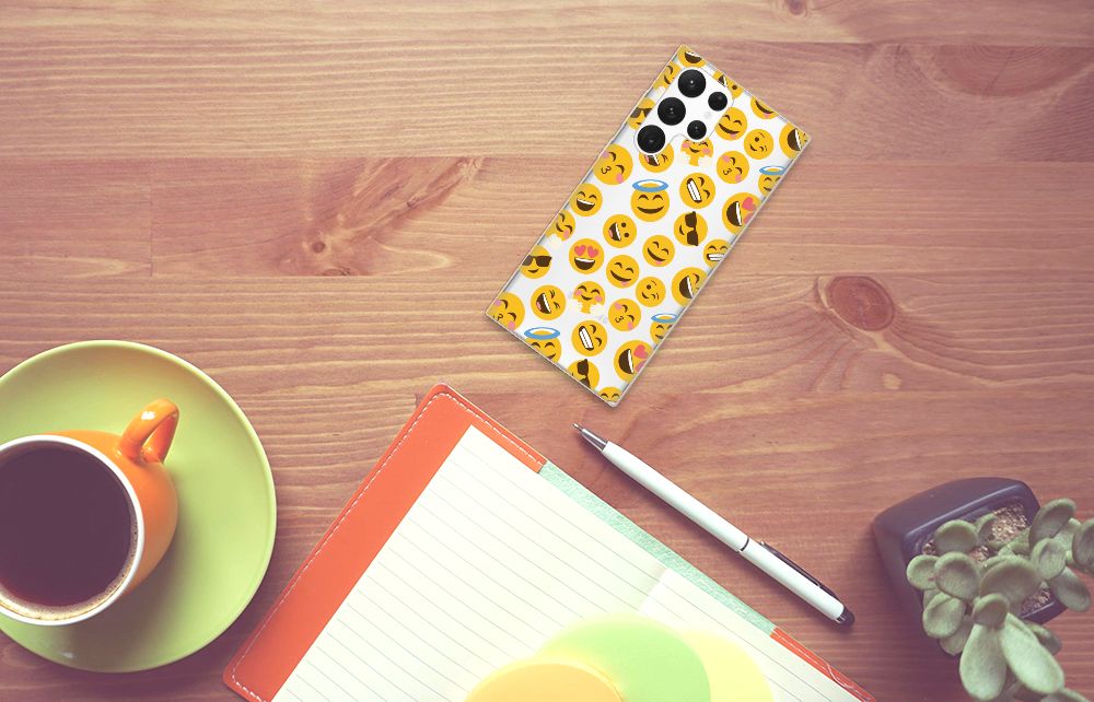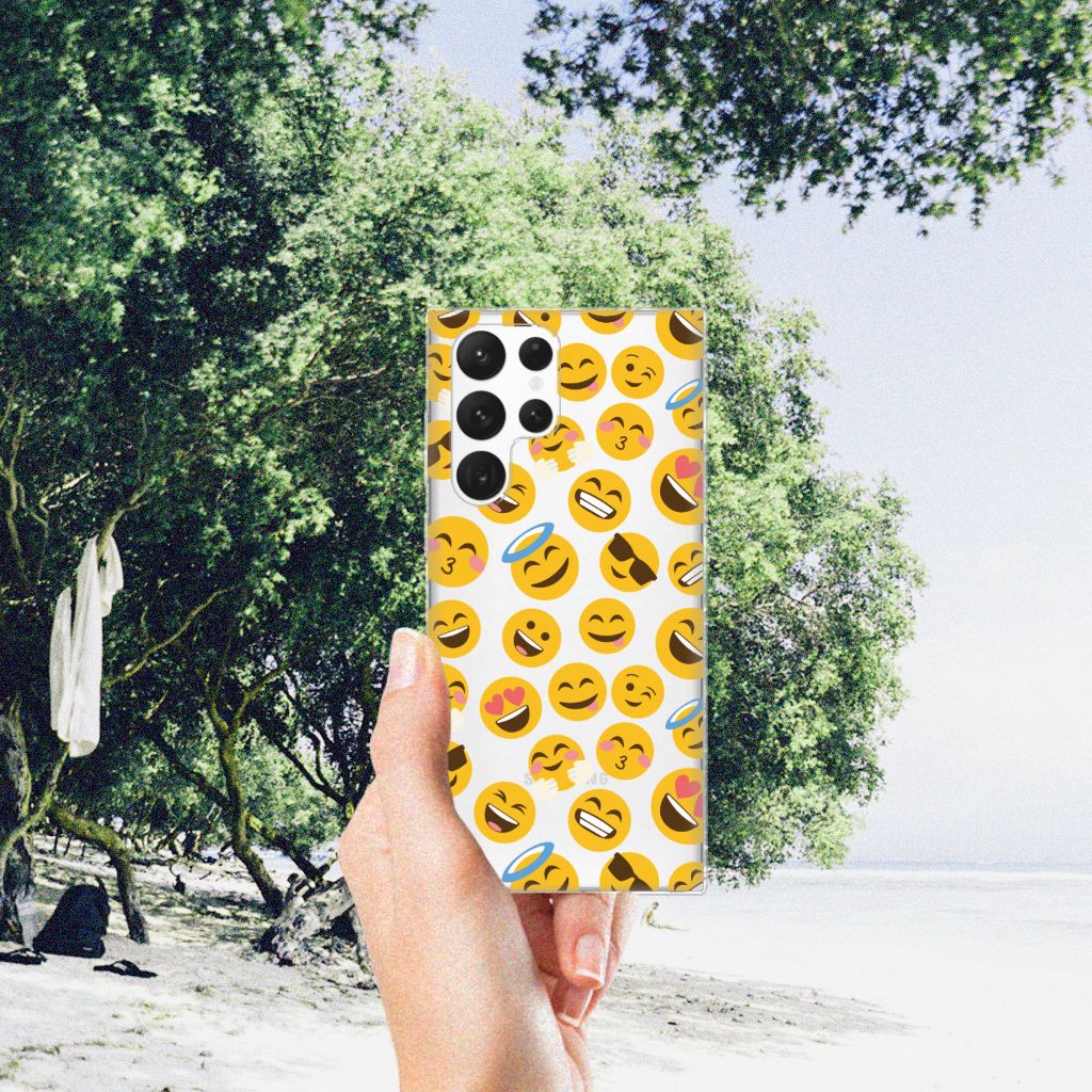 Je gebruikt ze waarschijnlijk dagelijks: emoji’s. Daarom hebben we besloten ze op een design hoesje te zetten. De kleurrijke, vaak gele emoticons maken chatberichten net wat spontaner. Dat hebben we allemaal te danken aan Japan, waar de emoji’s die we zo goed kennen vandaan komen. Ondertussen zijn er meer dan 1800! Deze passen natuurlijk niet allemaal op een Samsung Galaxy S22 Ultra TPU bumper, maar we hebben de meeste gebruikte exemplaren erop gezet. Deze tpu case is voorzien van opstaande randen zodat het touchscreen van je telefoon beter is beschermd. Super handig. Het TPU zelf is zeer flexibel en is op maat gemaakt. We gebruiken emoji’s vaak om complete woorden te vervangen. Dit smartphone hoesje zegt dan ook meer dan duizend woorden kunnen. De tpu case wordt alleen aan de bovenzijde bedrukt met emoji’s. De zijkanten van de case worden niet bedrukt en blijven transparant.