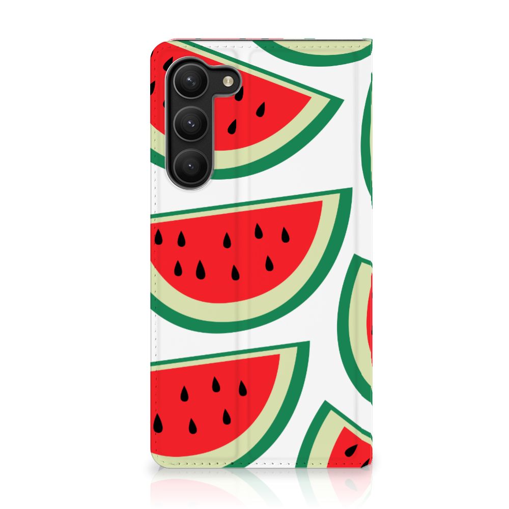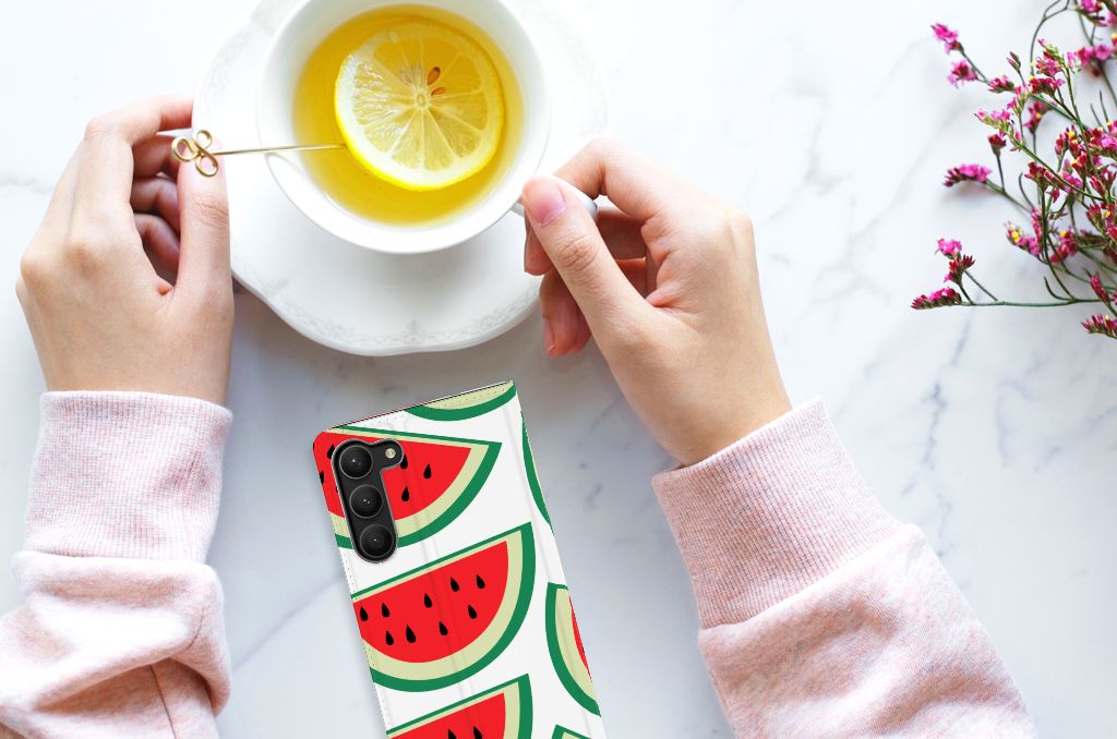 Watermeloenen zijn uitstekende dorstlessers, misschien dat je daarom juist in de zomermaanden extra enthousiast raakt van dit design hoesje Watermelons. Jij blijft gezond als je zo nu en dan een watermeloen neemt, jouw smartphone blijft in tact als je er deze Samsung Galaxy S23 Plus Flip Style Cover omheen doet. De stand case beschermt jouw telefoon aan alle kanten en beschikt over een 1 opbergvakje en een speciale standaard. Het hoesje wordt afgesloten met een magneet aan de binnenzijde. De houder aan de binnenzijde is van TPU. Je kunt ook kiezen voor andere soorten fruit op je hoesje. Kijk maar eens naar onze andere design hoesjes op onze website.