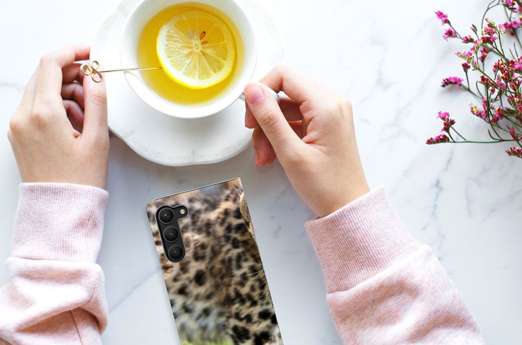 De luipaard is een grote, gespierde katachtige met korte, krachtige poten en een lange staart. Aangezien het op dit hoesje een baby luipaard betreft, zijn deze eigenschappen nog niet volledig tot wasdom gekomen. De kop van de luipaard is breed en een beetje rond van vorm met kleine, ronde oren. De snuit is middelgroot, met krachtige kaken en lange snorharen. De vacht van een luipaard is bedekt met veel zwarte vlekken. Kies je voor dit design hoesje, dan zal er van vlekken op jouw smartphone nooit en te nimmer sprake zijn. Het stoere en tegelijkertijd aandoenlijke design staat op een stand case. Een Samsung Galaxy S23 Plus Hoesje maken beschermt jouw telefoon aan alle kanten en beschikt over een 1 opbergvakje en een speciale standaard. Het hoesje wordt afgesloten met een magneet aan de binnenzijde. De houder aan de binnenzijde is van TPU.