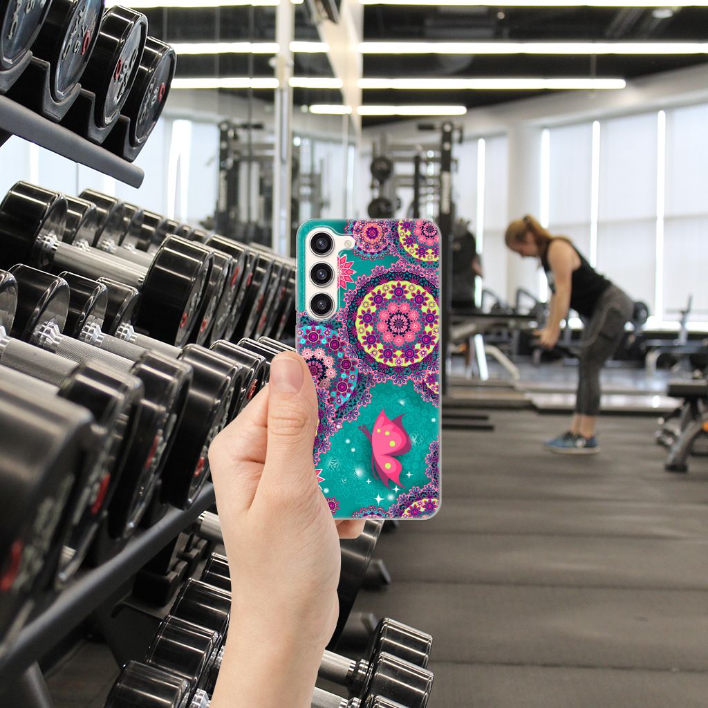 Deze opvallende Samsung Galaxy S23 Plus Hoesje maken met Cirkels en Vlinders is een ware eyecatcher. De meeste vlinders hebben een onopvallende vleugelkleur en dat kun je van de soort op dit hoesje ook zeker wel zeggen. Wij kunnen deze opvallende vlinders en cirkels op een zeer handige tpu case zetten. Deze hoesjes zijn gewild omwille hun flexibiliteit. Met onze geavanceerde printer zetten we de print van opvallende vlinders en cirkels op de achterkant van het hoesje. De case met vlinders en cirkels blijft aan de zijkanten doorzichtig, zodat je maximaal het design van je smartphone behoudt. Verder is je telefoon natuurlijk goed beschermd met deze tpu case met print van blauwe vlinders. De bovenkant wordt bedrukt, de zijkanten niet. Met een screenprotector bescherm je ook het scherm maximaal.