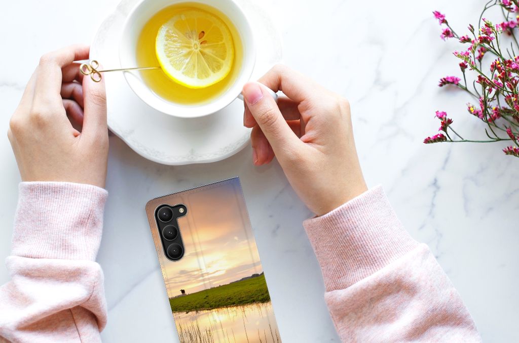 Het levert een idyllisch plaatje op, dit hoesje met een koe en ondergaande zon op de achtergrond. Door een koe buiten te laten lopen en grazen, hebben ze minder kans om ziek te worden. De Koe graast het liefst met soortgenoten, al zijn deze een stukje van de koe op de case verwijderd. Dit levert ook een mooi plaatje op, zoals je kunt zien op dit design hoesje. Deze stand case ziet er strak uit en is voorzien van verschillende uitsparingen. Een Samsung Galaxy S23 Plus Hoesje maken met magneet aan de binnenzijde beschermt jouw smartphone overal. Alle zijden zijn bedrukt. Koeien hebben lange graasperioden nodig, afgewisseld door rust- en herkauwperioden. Zo goed als grazen voelt voor koeien, zo lang zal jouw design hoesje meegaan. De binnenkant van de stand case is van TPU, de buitenzijde van leer.