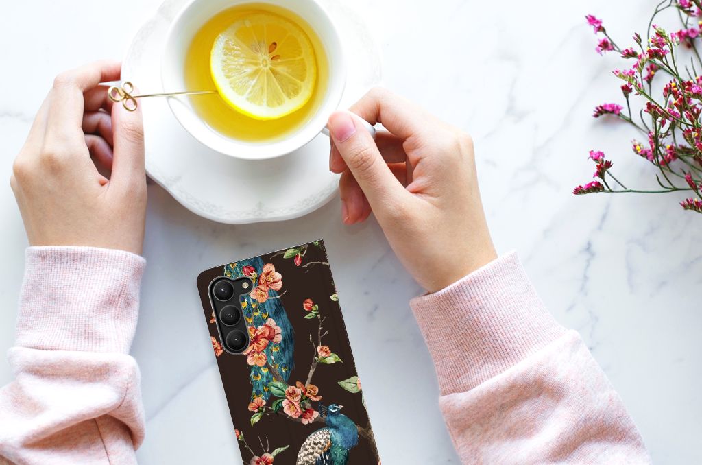 Op deze Samsung Galaxy S23 Plus Hoesje maken kun jij zo trots als een pauw zijn. Met dit geweldige design hoesje met een Pauw met Bloemen erop kun jij je smartphone voor zeer lange tijd beschermen. Deze stand case is zeer duurzaam en heeft aan de binnenkant een opbergvakje, waarin je een fitnesspas of pinpas kwijt kunt. Met een stand case met fleurige bloemen en trotse pauwen wordt jouw telefoon er een stuk mooier op. De onderscheidend case heeft een houder van TPU en een magneet aan de binnenkant. Zie jij liever jouw eigen huisdier op een telefoonhoesje? Dan adviseren we je zelf een hoesje te ontwerpen met onze unieke Phone Case Designer. We bedrukken alle zijden van de stand case, met duurzame inkt.