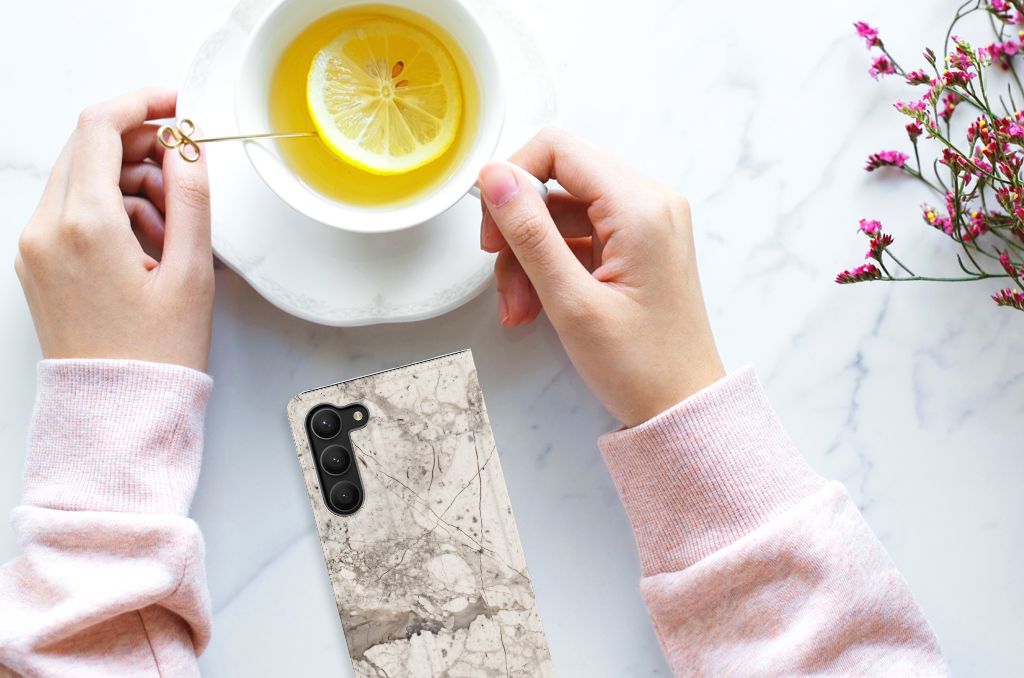 Dit design hoesje met Marmer Beige is voor de artistieke personen onder ons. De Grieken en Romeinen wisten het steen al te waarderen door het als bouw- en bekledingsmateriaal toe te passen. Naast het witte Carrara marmer met haar zacht grijze geaderde belijning zijn de diverse marmersoorten in een ruim kleurenpallet te krijgen. We hebben verschillende kleuren op design hoesjes gezet, zoals in dit geval beige marmer. Dit is een Samsung Galaxy S23 Plus Standcase met marmer in beige kleur. Het marmer wordt bedrukt op alle zijden van een stand case, die beschikt over 1 vakje voor een pasje en toebehoren en een magnetische sluiting aan de binnenkant. Verder heeft de case een houder van TPU. De rijkheid aan kleuren en varianties in afwerking geeft designers de vrijheid om met marmer hele mooie architectonische projecten te realiseren. Wij hebben onze designer ook veel vrijheid gegeven. Het resultaat zie je terug in deze stand case met beige marmer, dat de ideale bescherming voor jouw smartphone biedt.