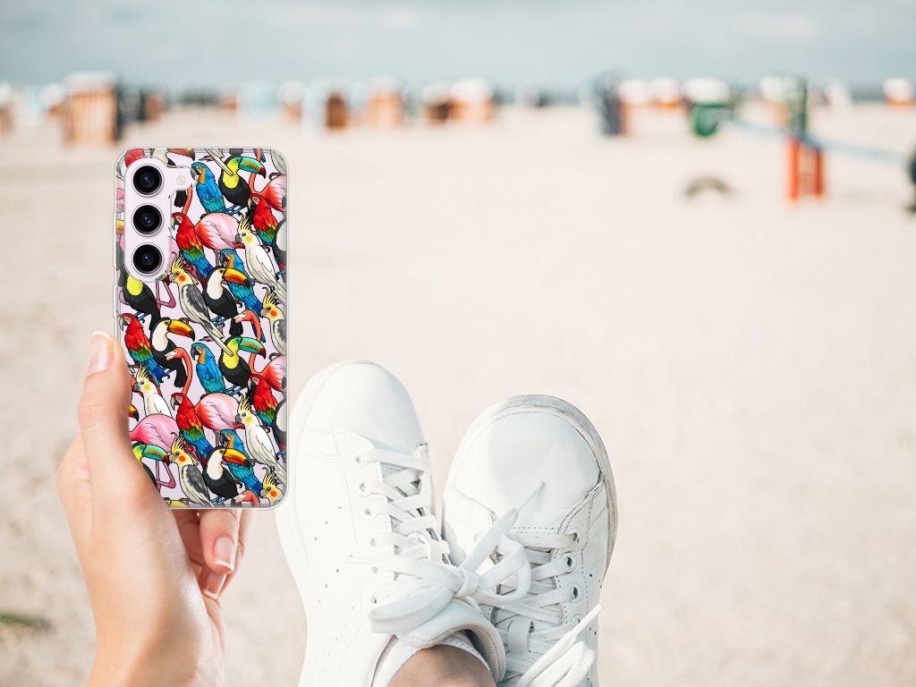 Dit exotische hoesje vol prachtige vogels is een genot voor het oog. Dankzij de felgekleurde toekans, papegaaien, flamingo’s en kaketoes op dit design word je meteen vrolijk als je naar dit hoesje kijkt. Je waant je meteen in de tropen met dit bonte gezelschap tegen een witte achtergrond. Het ontwerp staat op een TPU Hoesje voor de Samsung Galaxy S23. TPU is een flexibel en onbreekbaar materiaal. Zo is je telefoon aan de achterkant en de randen heel goed beschermd. De case met het birds-design is aan de bovenkant bedrukt, de randen blijven transparant. Het TPU-hoesje is perfect te combineren met een screenprotector. Zo zijn je telefoon en je beeldscherm optimaal beschermd.