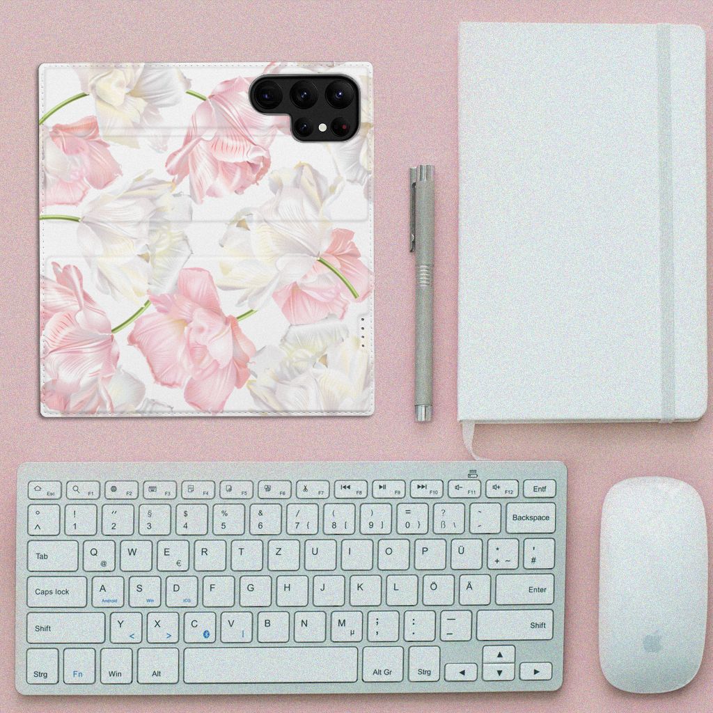 Een bosje bloemen doet een mens (en zijn smartphone) goed. De witte en roze bloemen op dit Samsung Galaxy S23 Ultra Smart Cover geven jouw smartphone een zeer mooie uitstraling. Je wordt er ook meteen een stuk rustiger van als je aan het appen of aan het bellen bent. Valt dan je telefoon op de grond, dan zal er dankzij de stand case met het design Lovely Flowers ontstaan. Onze stand cases met roze en witte bloemen zien er zeer prettig uit en zijn heel praktisch, wat blijkt uit onder meer het vakje aan de binnenkant en de handige standaard waarmee je de smartphone rechtop op tafel neer kunt zetten. De roze en witte bloemen passen goed op alle zijden van de case. Op deze stand case van leer en TPU (houder aan de binnenkant) kun je trouwens ook je eigen bloemige ontwerp zetten. In een paar simpele stappen maak je zelf een stand hoesje met daarop jouw mooiste bloemen.