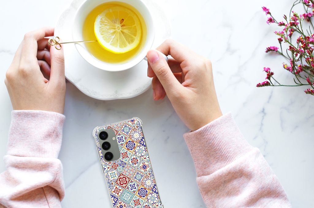 Ben je op zoek naar een uniek telefoonhoesje voor je Samsung Galaxy S24? Dan ben je bij B2C Telecom aan het juiste adres! Speciaal voor jou hebben we dit prachtige Tiles Color design in onze collectie hoesjes opgenomen. Het design wordt bedrukt op een Anti-Shock Hoesje en is gemaakt van flexibel rubber. Het hoesje is perfect voor de actieve smartphonegebruiker door de opstaande randen/hoeken. Denk aan mensen die veel sporten, reizen of wandelen en net iets meer zekerheid willen als het op hun geliefde telefoon aankomt. Het design wordt alleen aan de bovenkant van het hoesje bedrukt en de randen blijven transparant. Aan de zijkanten zijn uitsparingen gemaakt waardoor je met gemak alle knoppen en poorten kunt bedienen. Wij adviseren om dit hoesje in combinatie met een screenprotector te gebruiken voor een langere levensduur van je telefoon. Wil je dit hoesje nog iets extra's geven? Voeg dan gratis je naam of een quote toe! Is dit design hoesje toch niet helemaal wat je zocht? Ontwerp dan zelf een hoesje in ons ontwerpprogramma.