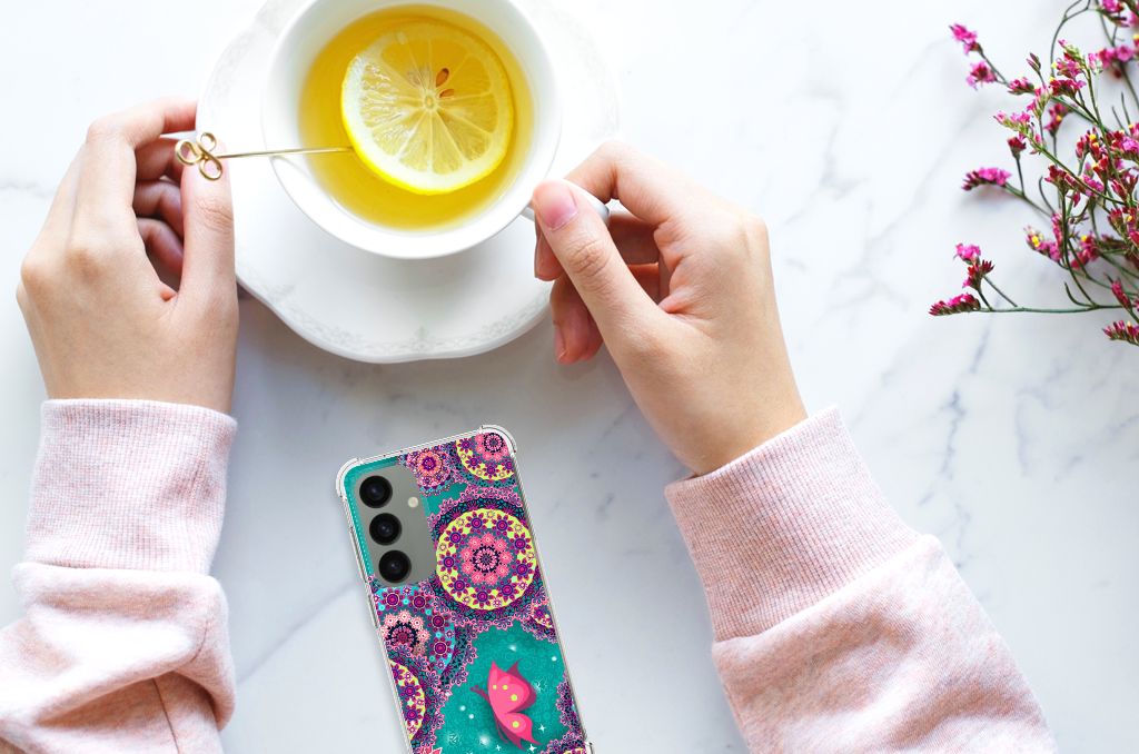 Ben je op zoek naar een uniek telefoonhoesje voor je Samsung Galaxy S24? Dan ben je bij B2C Telecom aan het juiste adres! Speciaal voor jou hebben we dit prachtige Cirkels en Vlinders design in onze collectie hoesjes opgenomen. Het design wordt bedrukt op een Back Cover en is gemaakt van flexibel rubber. Het hoesje is perfect voor de actieve smartphonegebruiker door de opstaande randen/hoeken. Denk aan mensen die veel sporten, reizen of wandelen en net iets meer zekerheid willen als het op hun geliefde telefoon aankomt. Het design wordt alleen aan de bovenkant van het hoesje bedrukt en de randen blijven transparant. Aan de zijkanten zijn uitsparingen gemaakt waardoor je met gemak alle knoppen en poorten kunt bedienen. Wij adviseren om dit hoesje in combinatie met een screenprotector te gebruiken voor een langere levensduur van je telefoon. Wil je dit hoesje nog iets extra's geven? Voeg dan gratis je naam of een quote toe! Is dit design hoesje toch niet helemaal wat je zocht? Ontwerp dan zelf een hoesje in ons ontwerpprogramma.