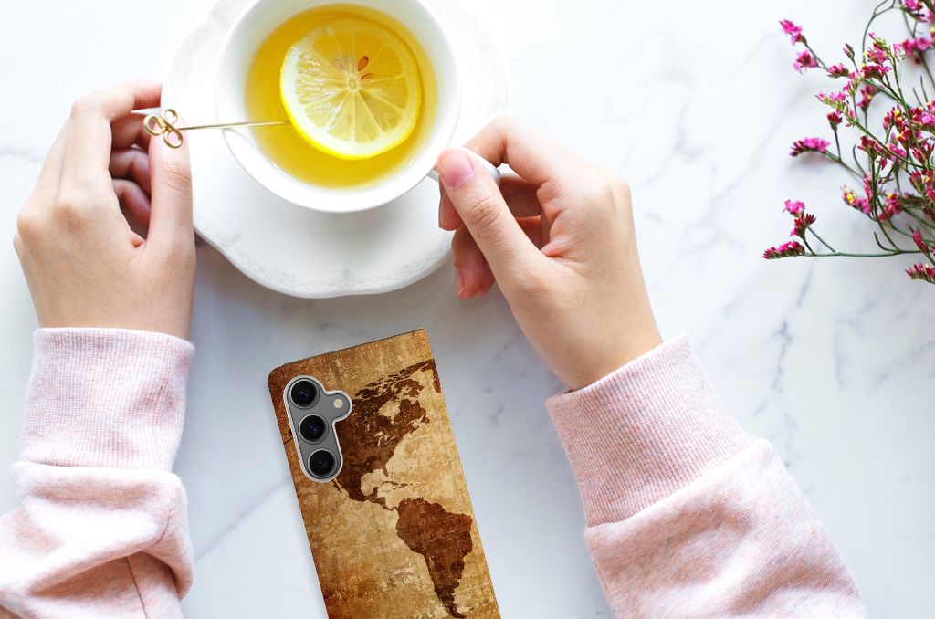 Als je een hoesje koopt met een wereldkaart, kun jij op veilige wijze met je smartphone rond de wereld reizen. Ga je zonder een boekhoesje met wereldkaart het buitenland verkennen, dan loop je veel te groot risico dat je stukken krijgt aan je smartphone. Met als gevolg dat je de belangrijke gebeurtenissen op je reis wellicht niet meer vast kunt leggen om door te sturen aan je vrienden. In het slechtste geval wordt jouw toestel zonder een smartphone hoesje met wereldkaart onbruikbaar. Wij kunnen de wereldkaart bedrukken op een stand case. Een Samsung Galaxy S24 Book Cover beschermt jouw telefoon aan alle kanten en beschikt over een 1 opbergvakje en een speciale standaard. Het hoesje wordt afgesloten met een magneet aan de binnenzijde. De houder aan de binnenzijde is van TPU. Dit stand hoesje met wereldkaart is voor een zeer laag bedrag te bestellen.