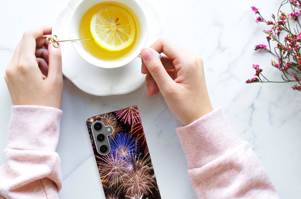 Deze Samsung Galaxy S24 Hippe Standcase levert gegarandeerd Vuurwerk op. Kijk alleen al eens naar de print van siervuurwerk, in zeer veel verschillende kleuren. Als je dit hoesje ziet kun je bijna niet geloven dat sommige gemeenten in Nederland overwegen om vuurwerk te verbieden. Er gebeuren weliswaar ongelukken mee, maar zoiets schitterends als op deze stand case met vuurwerk wil je toch gewoon niet missen. Bovendien beschermt dit hoesje jouw smartphone aan alle kanten. Alle zijden van deze case worden bedrukt en met een speciale standaard is het erg prettig om filmpjes te bekijken. De case wordt aan de binnenzijde met een magneet afgesloten en de houder aan de binnenzijde is van TPU. Onder alle omstandigheden zal deze case met 1 opbergvakje perfect functioneren, ook als je met nieuwjaar vuurwerk aan het afsteken bent. Zorg dan overigens wel dat je zelf ook voldoende afgeschermd bent van het vuurwerk.