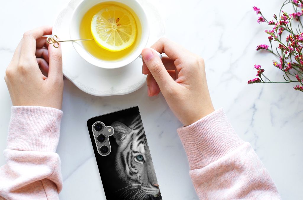 Omdat de Witte Tijger zo bijzonder is, zijn wij bereid deze voor zeer lage kosten op een stand case te zetten. Dit kunnen we zo goedkoop doen omdat we het drukwerk in eigen beheer doen. Witte tijgers leefden lange tijd in de bossen van India, Bangladesh, Nepal, Bhutan en China en kunnen wel 257 kilo wegen. Dit zwaargewicht kunnen we bedrukken op verschillende soorten hoesjes, zoals deze stand cases. Het Samsung Galaxy S24 Hoesje maken is van PU-leer (buitenzijde) en TPU (binnenzijde) en beschikt over een houder voor pasjes en briefgeld. Verder is dit hoesje met witte tijger print voorzien van magneten aan de binnenzijde. Tegenwoordig zijn witte tijgers alleen in gevangenschap te bewonderen. Jij zorgt voor de perfecte bescherming van je smartphone met dit design hoesje met witte tijger.