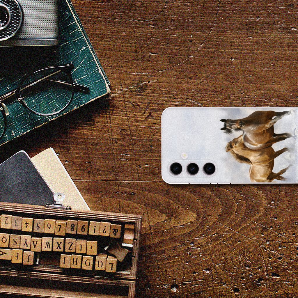 Voor de paardenliefhebbers onder ons hebben we onze collectie uitgebreid met dit design hoesje met print van paarden. Vroeger hield de mens vooral werkpaarden, inmiddels hebben we vriendschap gesloten met het paard. Vandaar dat het ook een favoriet dier is op onze smartphonehoesjes, zoals deze tpu case. Een TPU Hoesje voor de Samsung Galaxy S24 Plus met Paarden is niet alleen super mooi en chique, maar ook nog eens zeer flexibel. Verder is de case schokabsorberend en heeft het opstaande randen. Zie je liever je eigen paard terug op een hoesje. Dat kan! Door zelf een uniek hoesje te ontwerpen, met eigen foto’s en teksten. De TPU case wordt aan de bovenzijde bedrukt, de zijkanten blijven transparant.