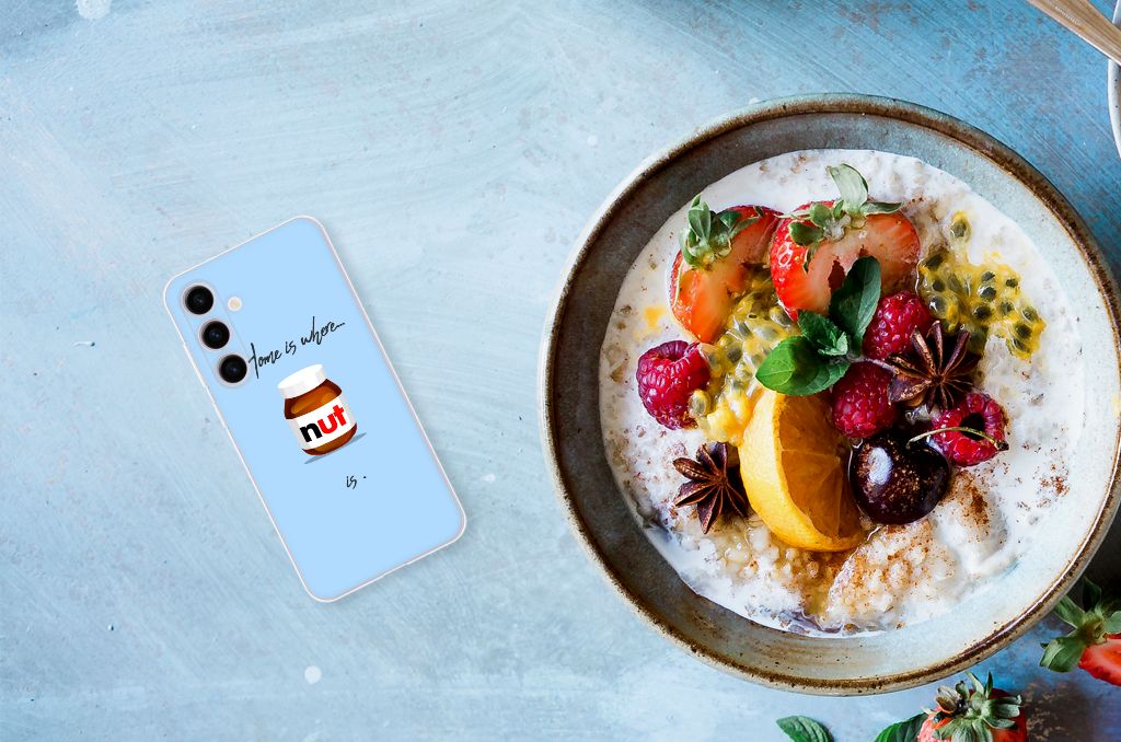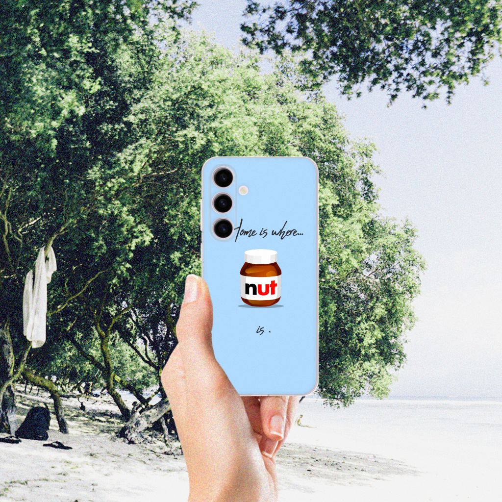 Ben je liefhebber van chocoladepasta, dan is dit het perfecte Samsung Galaxy S24 Siliconen Case voor jou. De chocoladepasta is enorm populair, dus is het niet zo heel gek dat je een ‘Nut Home’ tpu case in een blauwe kleur aantreft in ons assortiment design hoesjes met illustraties. Dit tpu hoesje is zeer flexibel en past altijd in je broekzak. Alleen de bovenkant van dit hoesje wordt door ons bedrukt in blauwe kleur met de pasta, op zeer duurzame manier. Mensen die houden van de bekendste pasta van het moment, kiezen voor deze blauwe tpu case. Er staan geen illustraties op de zijkanten van een tpu case. Je kunt ook een eigen tekst toevoegen aan het opvallende design.
