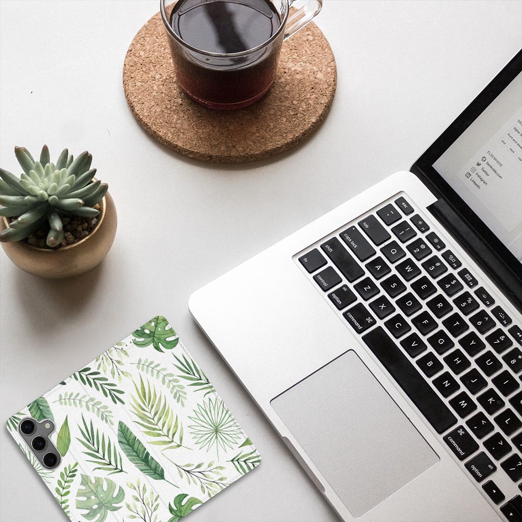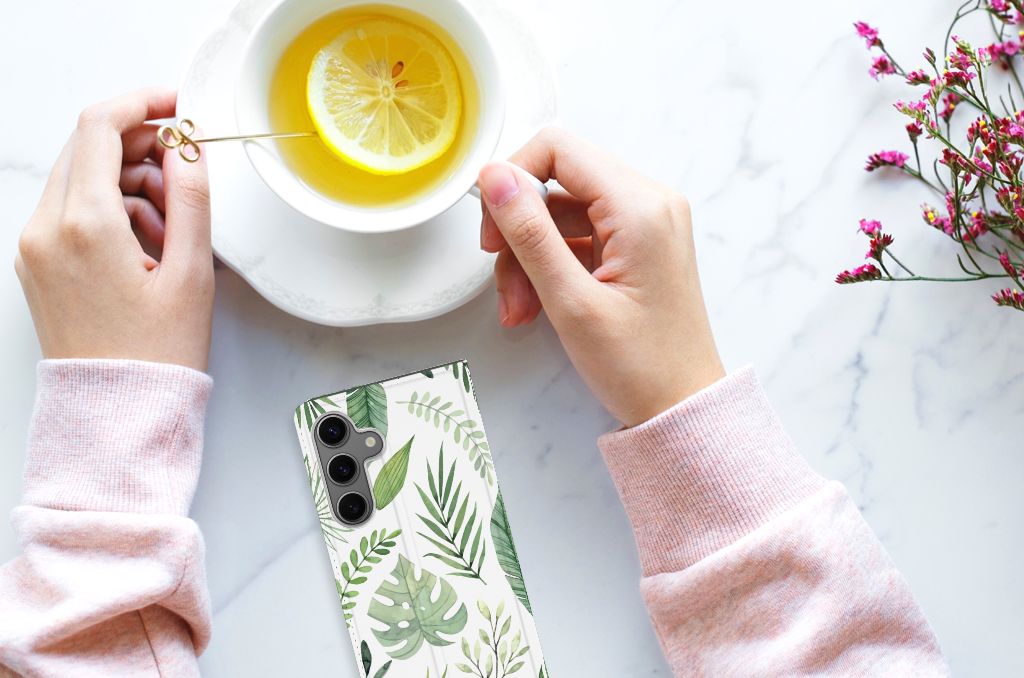 Je voelt je verbonden met de natuur als je kiest voor deze Samsung Galaxy S24 Smart Cover met print Leaves. De print bestaat uit verschillende groene bladeren en dit zorgt voor een fraai decoratief geheel. Met dit patroon van groene bladeren creëer je een frisse uitstraling voor jouw smartphone. Jij doet er verstandig aan om je telefoon te beschermen met dit design hoesje met groene bladeren, die staan op een stand case. Dit hoesje kenmerkt zich onder meer door het handige vakje aan de binnenzijde en de magnetische sluiting aan de binnenzijde. Voel jij jezelf gezond met een beeld van groene bladeren, dan is deze stand case met print een uitstekende optie. Het beschermt jouw telefoon aan alle zijden. Het TPU aan de binnenzijde klemt zich perfect om jouw smartphone. Kijk ook eens naar onze andere hoesjes met bladeren of misschien maak je zelf wel gewoon liefst je eigen hoesje met eigen foto’s van bladeren.