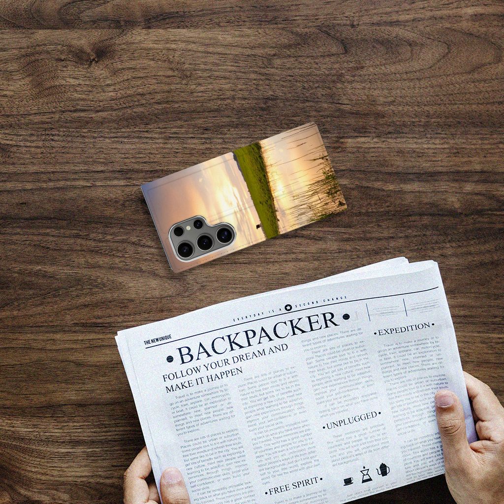 Het levert een idyllisch plaatje op, dit hoesje met een koe en ondergaande zon op de achtergrond. Door een koe buiten te laten lopen en grazen, hebben ze minder kans om ziek te worden. De Koe graast het liefst met soortgenoten, al zijn deze een stukje van de koe op de case verwijderd. Dit levert ook een mooi plaatje op, zoals je kunt zien op dit design hoesje. Deze stand case ziet er strak uit en is voorzien van verschillende uitsparingen. Een Samsung Galaxy S24 Ultra Hoesje maken met magneet aan de binnenzijde beschermt jouw smartphone overal. Alle zijden zijn bedrukt. Koeien hebben lange graasperioden nodig, afgewisseld door rust- en herkauwperioden. Zo goed als grazen voelt voor koeien, zo lang zal jouw design hoesje meegaan. De binnenkant van de stand case is van TPU, de buitenzijde van leer.