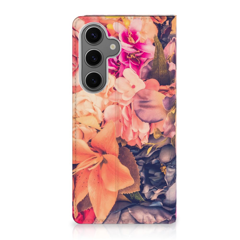 Dit Bosje Bloemen doet een mens en zijn smartphone goed. De oranje, paarse en roze bloemen op deze Samsung Galaxy S24FE Smart Cover geven jouw smartphone een zeer sierlijke uitstraling. Je wordt er ook meteen vrolijker van als je aan het appen, mailen of aan het bellen bent. Valt dan je telefoon op de grond, dan zal er dankzij de stand case met oranje, paarse en roze bloemen geen schade ontstaan. Onze stand cases met oranje, paarse en roze bloemen bieden de allerbeste bescherming en zijn heel praktisch, wat blijkt uit onder meer het vakje aan de binnenkant en de handige standaard waarmee je de smartphone rechtop op tafel neer kunt zetten. De oranje, paarse en roze bloemen passen goed op alle zijden van de case. Op deze stand case van leer en TPU (houder aan de binnenkant) is het ook mogelijk je eigen ontwerp te zetten. In no time maak je zelf een stand case met daarop foto’s van jouw favoriete bloemen.