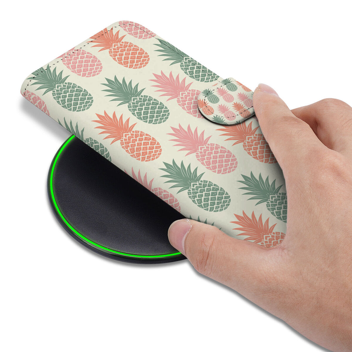 Dit hoesje is meer dan een bescherming; het is een fashion statement. Het gedetailleerde ananas-patroon wordt met de grootste zorg en met UV-bestendige inkt op de witte basis geprint, waardoor de levendige kleuren en fijne lijntjes van het ontwerp langdurig mooi blijven. De grijze binnenkant biedt een stijlvol contrast en is voorzien van drie kaartsleuven.