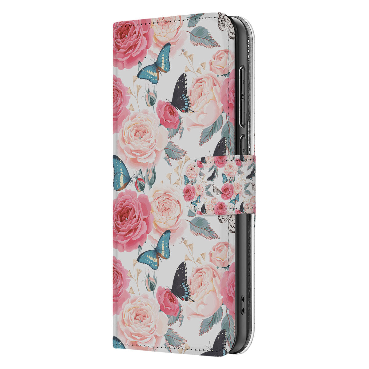 De delicate vlinders en de weelderige rozen creëren een sprookjesachtige sfeer. De zachte roze en roségouden tinten geven het geheel een luxe en vrouwelijke uitstraling. Dit hoesje is de perfecte accessoire voor de dromer en de romanticus, en biedt naast zijn betoverende look ook de praktische voordelen van een book case.
