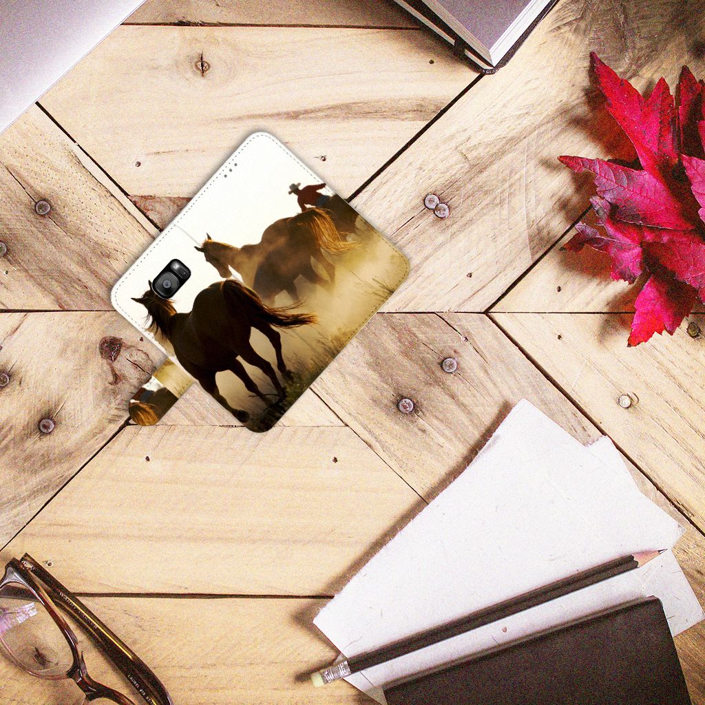 Voor de paardenliefhebbers onder ons hebben we onze collectie uitgebreid met dit design hoesje met print van een cowboy met paarden. Vroeger hield de mens vooral werkpaarden, inmiddels hebben we vriendschap gesloten met het paard. Vandaar dat het ook een favoriet dier is op onze smartphonehoesjes, zoals deze boekhoesjes. Dit Telefoonhoesje met Pasjes met paarden is niet alleen super mooi en chique, het sluit ook nog perfect dankzij het lipje aan de buitenzijde. Verder heeft de case een TPU houder aan de binnenzijde en houders voor pasjes en briefgeld. Zie je liever je eigen paard terug op een hoesje voor jouw Samsung Galaxy S7 Edge? Dat kan! Door zelf een uniek hoesje te ontwerpen, met eigen foto’s en teksten. Het boekhoesje met paarden wordt aan alle zijden bedrukt.