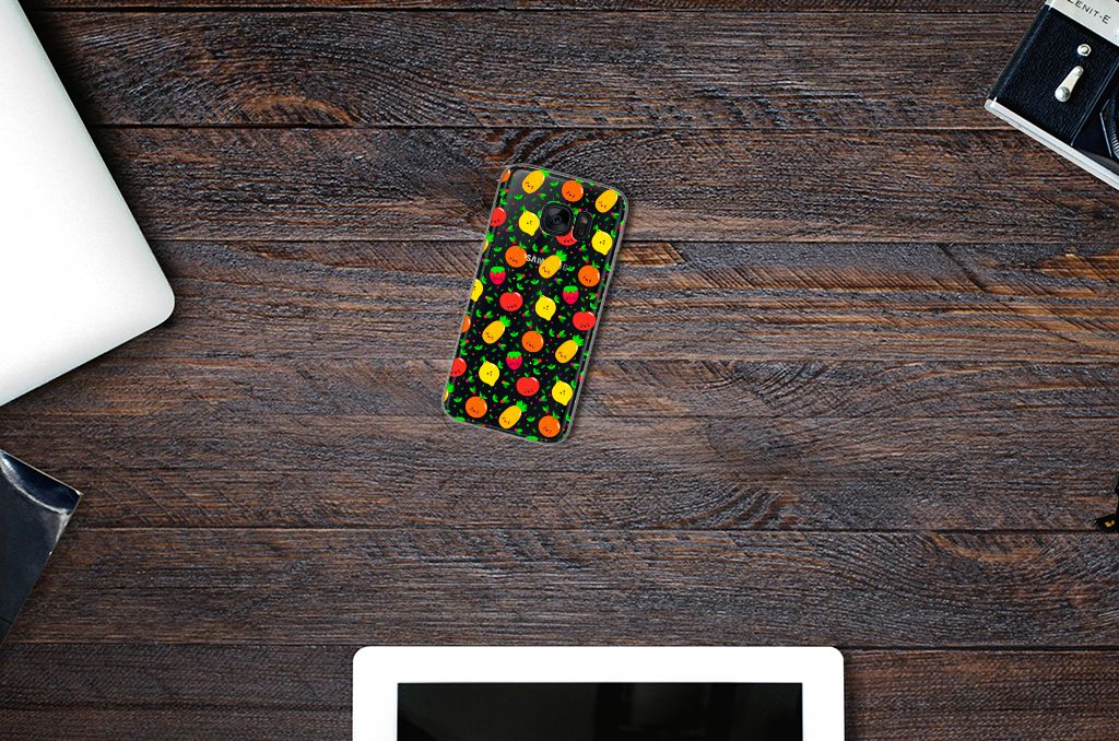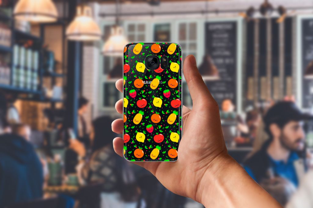 Een fris, fruitig en vrolijk hoesje, deze case met afbeeldingen van aardbeien, ananassen, appels, sinaasappels en citroenen. Minstens twee stuks fruit per dag wordt aanbevolen als dagelijkse hoeveelheid voor de mens. Dit verkleint de kans op allerlei ziekten. Dus met het aantal stukken fruit op de Samsung Galaxy S7 Siliconen Case zou je wel een maandje zoet moeten zijn. Met het hoesje zelf kun je je hele leven doen, dit is namelijk niet stuk te krijgen. Dit komt door het sterke en flexibele materiaal waarvan het gemaakt is. De vrolijk stemmende case het desing Fruits maakt jouw telefoon dus zeer duurzaam. Zorg ervoor dat jouw smartphone gezond blijft en kies voor dit hoesje met frivool fruit. Een tpu case met fruit wordt alleen aan de bovenkant bedrukt en is zeer flexibel. De randen van het hoesje blijven transparant en worden niet bedrukt met het fruit.