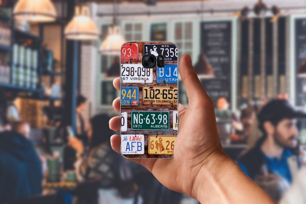Je gaat waarschijnlijk helemaal uit je plaat met deze Samsung Galaxy S7 Siliconen Hoesje met foto met Amerikaanse Kentekenplaten. Kentekenplaten van Utah, Virginia, Nebraska, Kansas en Iowa: ze komen allemaal voorbij op deze opzienbarende tpu case, te koop voor een zeer scherpe prijs. Behalve een hoes met een fraaie print van kentekenplaten krijg je ook een case met zeer veel praktische eigenschappen. Zoals het elastische materiaal, dat de ergste schokken en stoten zeer makkelijk opvangt als je telefoon op de grond valt. De case wordt aan de bovenkant bedrukt, terwijl de zijkanten transparant blijven. De case heeft opstaande randen, waardoor het scherm extra beschermd is. Samen met een screenprotector is een betere bescherming dan deze tpu case met Amerikaanse kentekenplaten nauwelijks denkbaar.