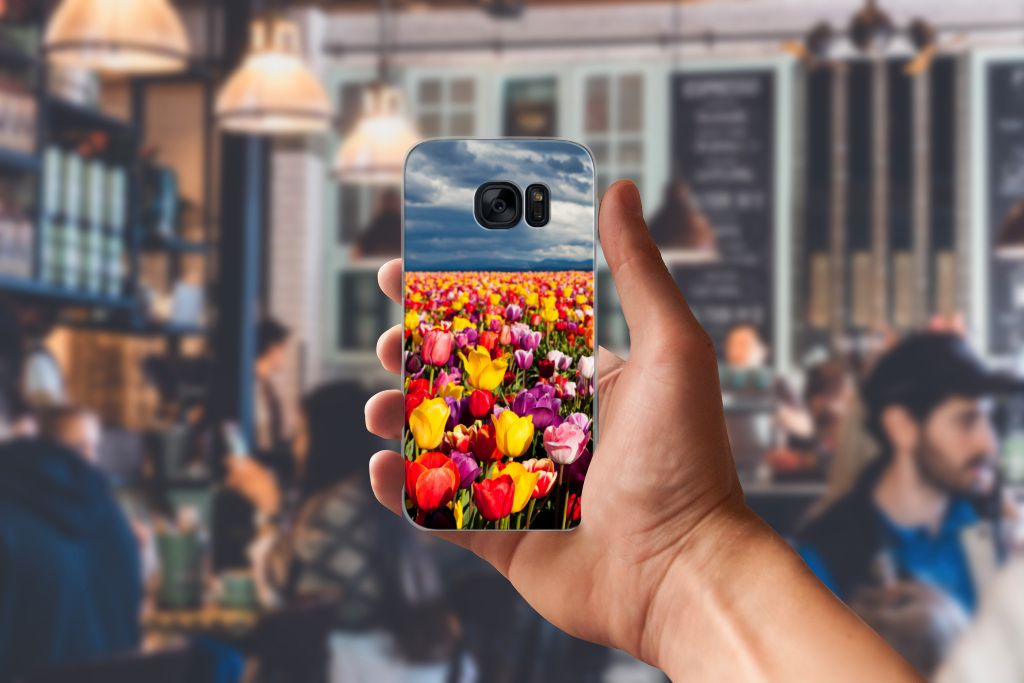 De tulp is een oer-Nederlandse bloem en heeft een lange geschiedenis. Deze Samsung Galaxy S7 TPU Case met Tulpen ziet er bijzonder kleurrijk uit. Dit fleurige smartphone hoesje geeft een bijzondere bescherming van jouw apparaat. Tulpen zijn ideaal voor een kleurrijk begin van het tuinseizoen. Iedereen wordt er vrolijk van om te zien hoe deze bloemen het voorjaar kleur geven en het begin van de warmere tijd van het jaar aankondigen. Dan kan het toch niet anders of jij wordt heel erg blij van deze tpu case met tulpen? Deze tpu case is zeer flexibel en past altijd in je broekzak. Het materiaal is zeer elastisch en onbreekbaar. De case wordt niet aan alle zijden bedrukt met tulpen. De randen blijven transparant. Je kunt ook zelf een tpu case maken met daarop jouw favoriete bloem.
