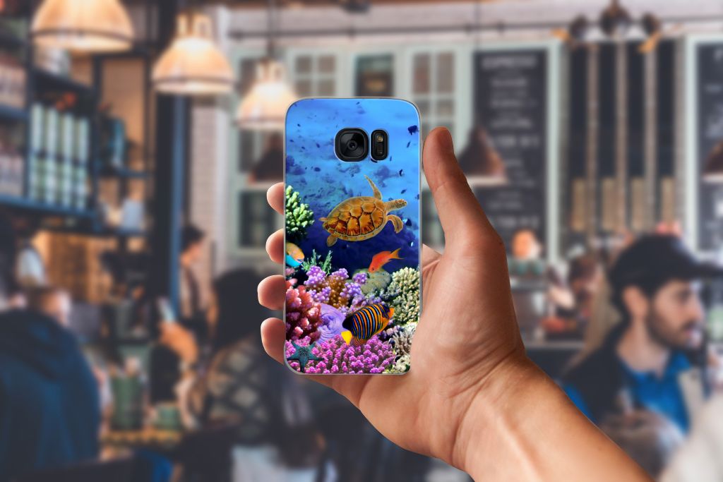 Dit kleurrijke hoesje met tropische Vissen is een ware eyecatcher. Als je aan het duiken bent en je treft een school aan met dit soort opvallende vissen, dan heb je een geweldige ervaring. Maar je hoeft er eigenlijk niet per se het water voor in te duiken. Want wij hebben een schitterende verzameling vissen op dit design hoesje gezet. Met onze zeer geavanceerde printer zetten we de afbeelding van vissen op de bovenkant van de Samsung Galaxy S7 TPU Hoesje, de randen blijven transparant. De case is gemaakt van zeer elastisch en onbreekbaar materiaal. Verder is je telefoon natuurlijk goed beschermd met deze tpu case met print van vissen. Deze case heeft tevens opstaande randen, waardoor je scherm de grond niet zal raken als de smartphone uit je handen valt.