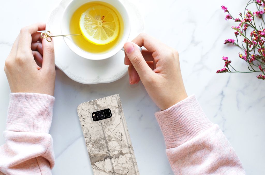 Dit design hoesje met Marmer Beige is voor de artistieke personen onder ons. De Grieken en Romeinen wisten het steen al te waarderen door het als bouw- en bekledingsmateriaal toe te passen. Naast het witte Carrara marmer met haar zacht grijze geaderde belijning zijn de diverse marmersoorten in een ruim kleurenpallet te krijgen. We hebben verschillende kleuren op design hoesjes gezet, zoals in dit geval beige marmer. Dit is een Samsung Galaxy S8 Standcase met marmer in beige kleur. Het marmer wordt bedrukt op alle zijden van een stand case, die beschikt over 1 vakje voor een pasje en toebehoren en een magnetische sluiting aan de binnenkant. Verder heeft de case een houder van TPU. De rijkheid aan kleuren en varianties in afwerking geeft designers de vrijheid om met marmer hele mooie architectonische projecten te realiseren. Wij hebben onze designer ook veel vrijheid gegeven. Het resultaat zie je terug in deze stand case met beige marmer, dat de ideale bescherming voor jouw smartphone biedt.