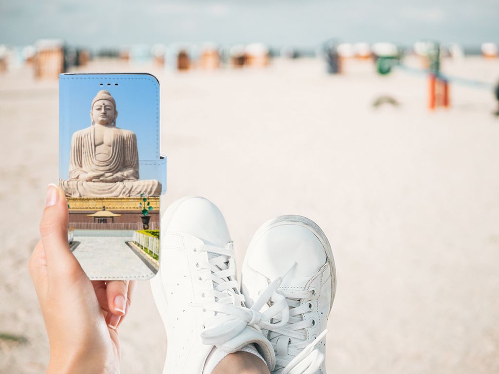 Van dit hoesje met boeddha print word je vanzelf rustig van binnen. Een boeddha staat te allen tijde voor geluk, symbolische genezing, liefde voor de ander, maar ook voor eigenwaarde. Daarnaast staat de boeddha symbool voor eeuwige vriendschap. Boeddhabeelden zie je vooral in tempels, maar tegenwoordig zien we ze ook steeds vaker in huizen en tuinen staan. Een boeddha dient met respect te worden behandeld. Doe dat dus ook met je telefoon. Dat kan met dit hoesje met Boeddha print. De case zorgt ervoor dat jij en je Samsung Galaxy S9 voor langere tijd in harmonie samen kunnen leven. Het design staat op een Flip Cover. Dit smartphonehoesje beschermt jouw telefoon aan alle zijden en beschikt over verschillende opbergvakjes voor pasjes en briefgeld. De case sluit perfect af met het lipje aan de buitenkant. De houder aan de binnenzijde is van TPU. Alle zijden van het hoesje worden bedrukt, inclusief het lipje.