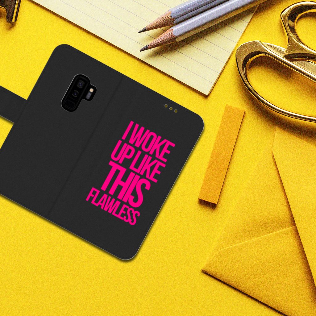 Met dit zwarte Samsung Galaxy S9 Plus Hoesje met naam met paarse tekst heb je een geweldige bescherming van je smartphone in handen. Dit zwarte hoesje met Woke Up tekst is een must voor jouw smartphone. Met dit design hoesje tekst val je ook zeker op. Je weet ook zeker dat het hoesje exclusief is. Het design is gemaakt door B2C Telecom. Het hoesje heeft verschillende vakjes en is aan alle zijden bedrukt. Ook het lipje aan de buitenkant kan worden bedrukt. De houder is van TPU, de buitenzijde van PU-leer. We willen je er ook op wijzen dat je zelf een hoesje kunt ontwerpen, met eigen beelden en teksten. Met onze Phone Case Designer kun je zelfs opvallende effecten, patronen en clip arts aan het ontwerp toevoegen.