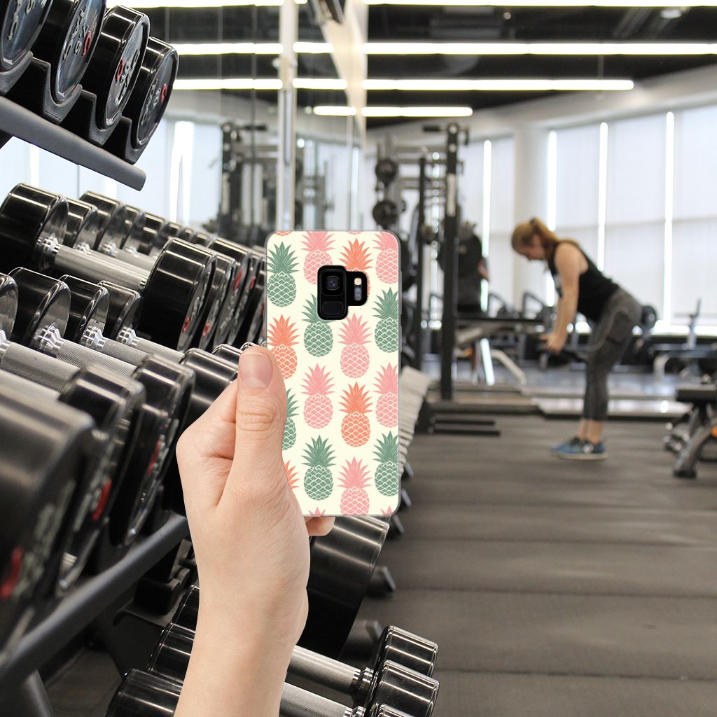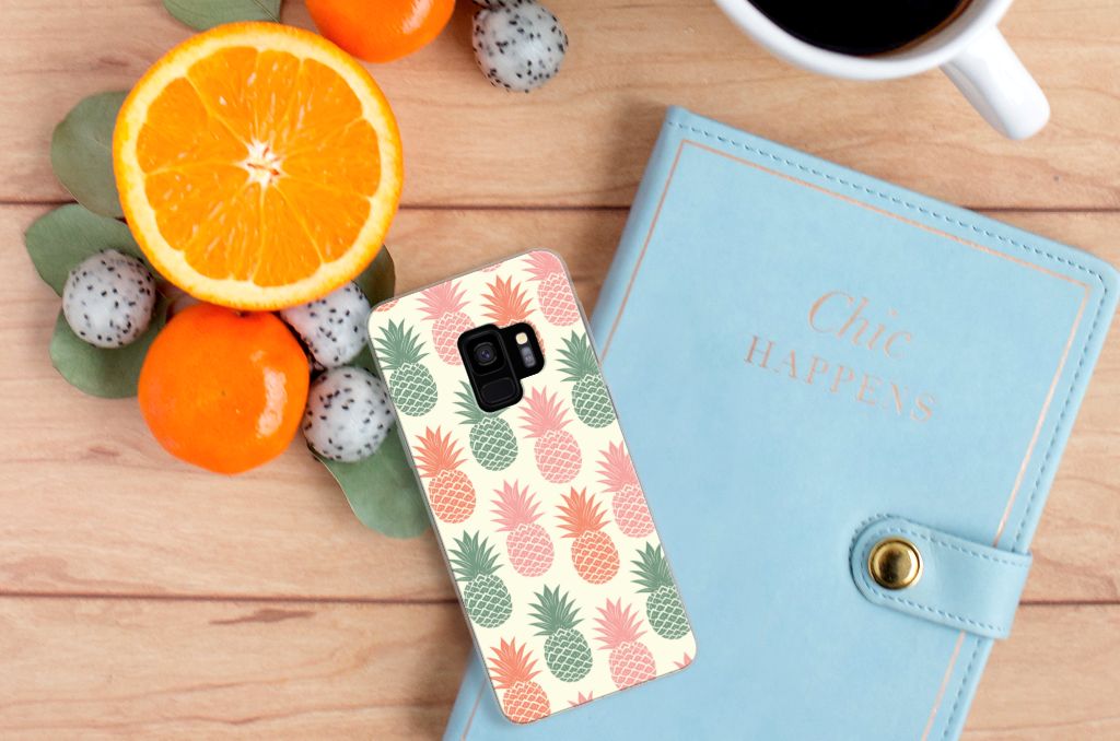 Ananas is een woord uit het Tupi, de taal van de Tupi-indianen, en betekent uitmuntende vrucht. Dit fruit van zeer hoge kwaliteit staat op onze superieure boekhoesjes, stand cases, hard cases en TPU cases. Jij blijft er gezond uitzien als je zo nu en dan een hap neemt van een Ananas , jouw smartphone blijft tip top in orde als je er een leuk telefoonhoesje omheen doet. Een ananas heeft stevig, veerkrachtig vruchtvlees. Een beetje te vergelijken met het TPU in onze hoesjes. TPU is elastisch materiaal, dat zeer buigzaam is. Vandaar dat het zeer schokbestendig is. Het ananas design staat op een staat op een TPU case. Deze Samsung Galaxy S9 Siliconen Case wordt alleen aan de bovenkant bedrukt en is zeer flexibel. De randen van het hoesje blijven transparant.