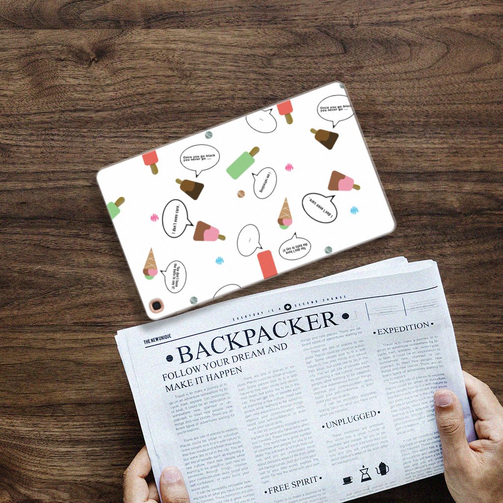 Van deze vrolijke Samsung Galaxy Tab A 10.1 (2019) Tablet Cover met daarop verschillende soorten ijsjes met tekstwolkjes krijg je sowieso een vrij en zomers gevoel. De zomer komt naar je toe met deze print van ijsjes met tekstwolkjes. Ben je op het strand, dan ontbreekt een lekker ijsje natuurlijk niet. Net zoals je je tablet bij de hand hebt, met daaromheen een design hoesje met bijzondere ijsjes en tekstwolkjes. Jouw tablet kan dan de bescherming in de vorm van een tablethoesje met ijsjes zeer goed gebruiken. De bovenkant van dit hoesje wordt bedrukt met ijsjes en tekstwolkjes, de zijkanten blijven doorzichtig. De case is gemaakt van schokabsorberend materiaal en past altijd in je tas. Onder alle weersomstandigheden zal deze case perfect functioneren, ook in de zomer met een ijsje in je hand.