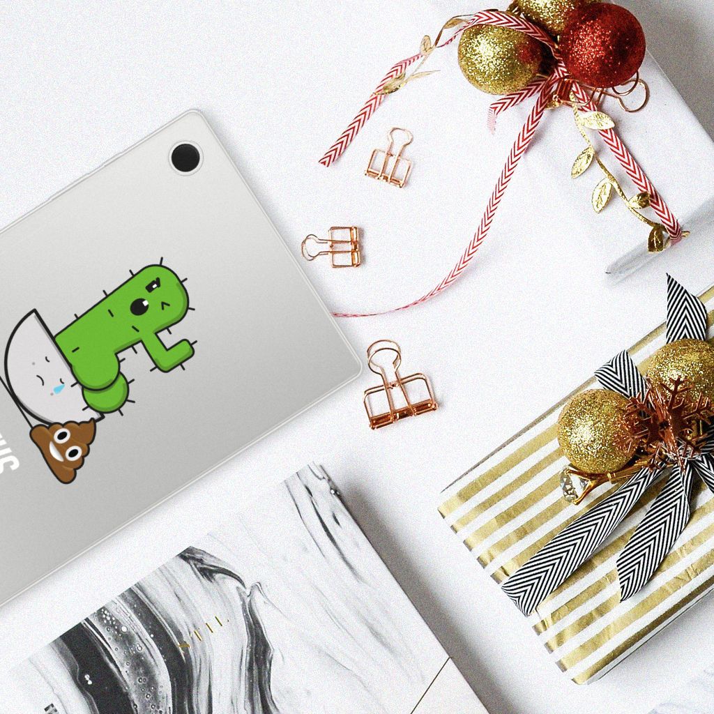 De cactus is leuk, hip en makkelijk te verzorgen. Maar wie denkt dat hij helemaal zonder aandacht kan, heeft het mis. Op dat moment komt hij in opstand, zoals op dit grappige design hoesje met cactus te zien is. Deze Tablet Back Cover met Cactus Poo design is van alle markten thuis. Het is een zeer veilig maar ook prachtig en praktisch hoesje. Dat bewijzen het flexibele en schokabsoberende materiaal en het lichte gewicht. De meeste cactussen komen uit Amerika. Daar groeien ze in hun natuurlijke omgeving, de woestijn en steppen. Maar ze groeien ook in tropische regenwouden. Dit geeft aan dat de cactus een plant is die zich makkelijk aanpast. Dat geldt dus helaas niet voor de cactus op dit tablethoesje, maar jouw Samsung Galaxy Tab A8 2021/2022 is wel goed beschermd. Valt de tablet op de grond, dan beschermen de opstaande randen van de case het touchscreen. Alleen de bovenkant van dit hoesje wordt bedrukt met de geinige kaktus. De zijkanten van de case blijven transparant.