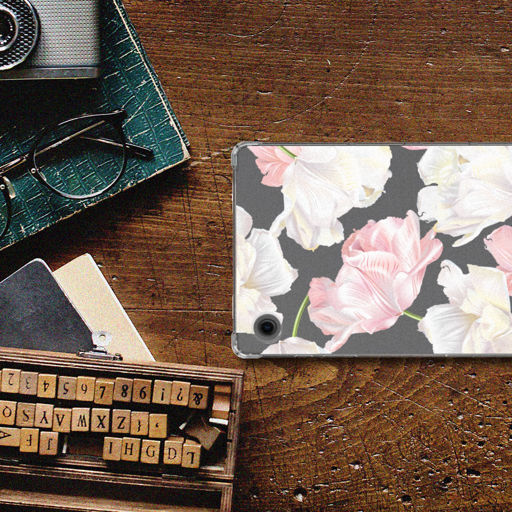 Een bosje bloemen doet een mens (en zijn tablet) goed. De witte en roze bloemen op deze Samsung Galaxy Tab A9 Siliconen Hoesje geven jouw tablet een zeer mooie uitstraling. Je wordt er ook meteen een stuk rustiger van als je aan het appen of aan het bellen bent. Valt dan je tablet op de grond, dan zal er dankzij deze case met het design Lovely Flowers ontstaan. Helemaal niet als je er een screenprotector bij hebt gekocht. Onze hoesjes met roze en witte bloemen zien er zeer prettig uit en zijn heel praktisch, getuige onder meer de opstaande randen en het flexibele materiaal. Alleen de achterkant van het hoesje wordt bedrukt met roze en witte bloemen en de randen blijven transparant.