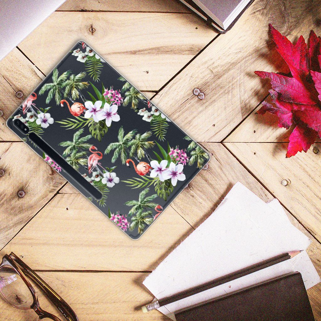 Een Samsung Galaxy Tab S7 Plus | S8 Plus Back Case met Flamingo Palms is in vele opzichten bijzonder. De rode flamingo op het hoesje kent zijn oorsprong in het Caraïbische gebied. Stel dat je in deze regio vakantie aan het vieren bent, dan val je zonder meer op met dit hoesje met flamingo’s en palmbomen. Dit hoesje beschermt je tablet met name aan de achterkant en de zijkanten. Het hoesje met flamingo’s en palmbomen en is ook zeer flexibel. De zijkanten van case blijven transparant.